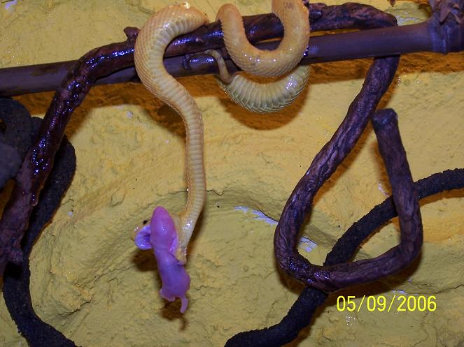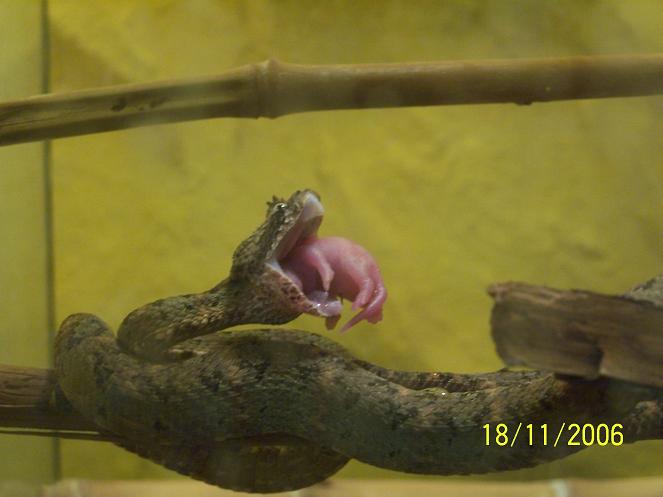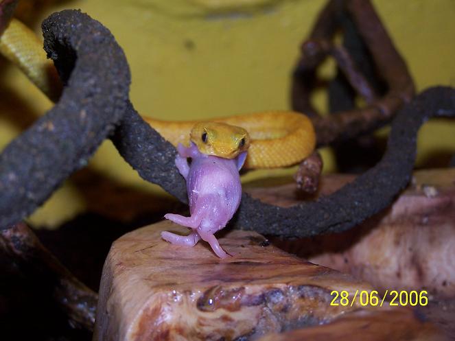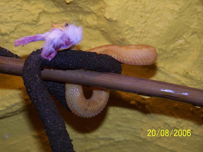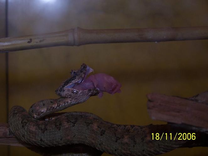 Las babys.... yo he tenido muchos problemas con babys de botriechis , no suelen entrar a raton en sus primeros meses de vida , en cambio a lagartos pequeños y a ranitas era una maravilla , otra opcion es el embuchado ( pero no te lo recomiendo en absoluto si no tienes amplia experiencia por lo pequeño del animal y su potente veneno ( !!! NO TE LA JUEGUES !!! ) .