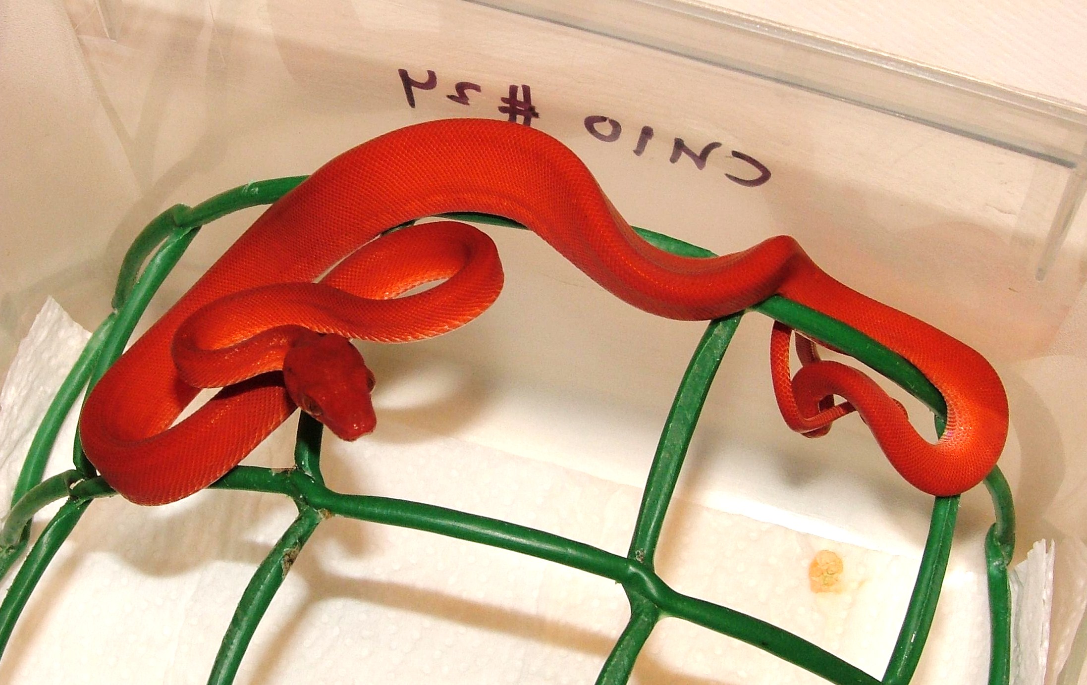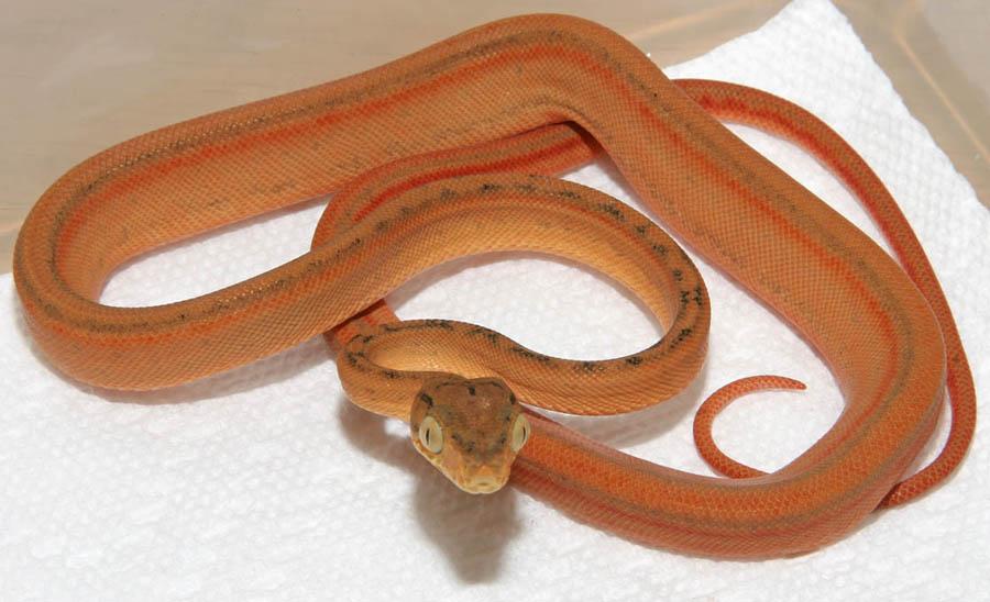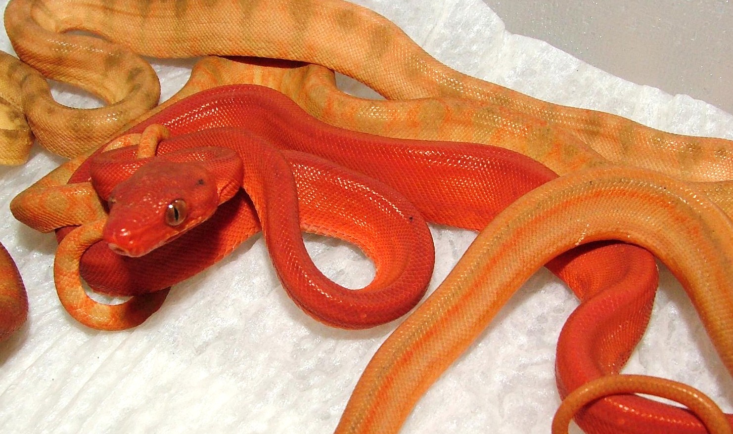 Estos 2 machitos aun siendo rojos por igual manifestaban una notable diferencia ya desde recién paridos y es que uno presentaba un patrón clásico Tiger en melanina con ténues líneas dorsolaterales y patrón cefálico muy reducido, mientras que su hermano resultaba ser un Tiger rojo patternless o prácticamente patternless ya que siendo precisos sí que presentaba unas marcas cefálicas extremadamente reducidas junto con una ausencia total de líneas dorsolaterales.