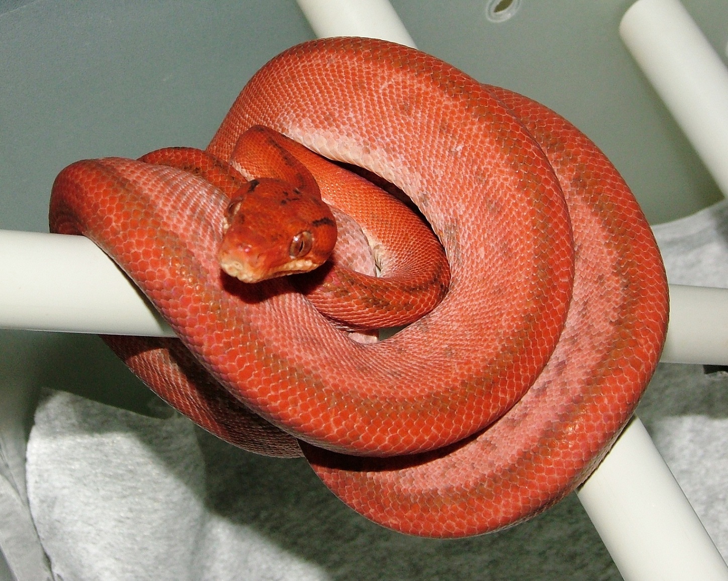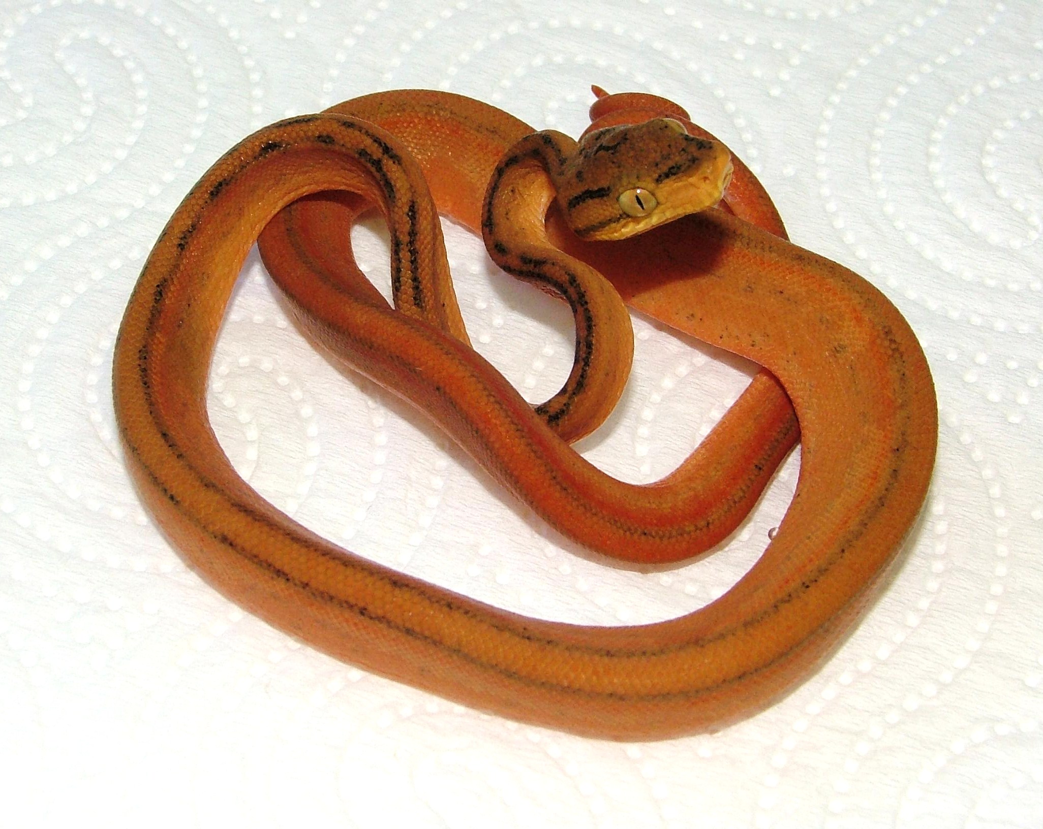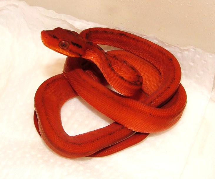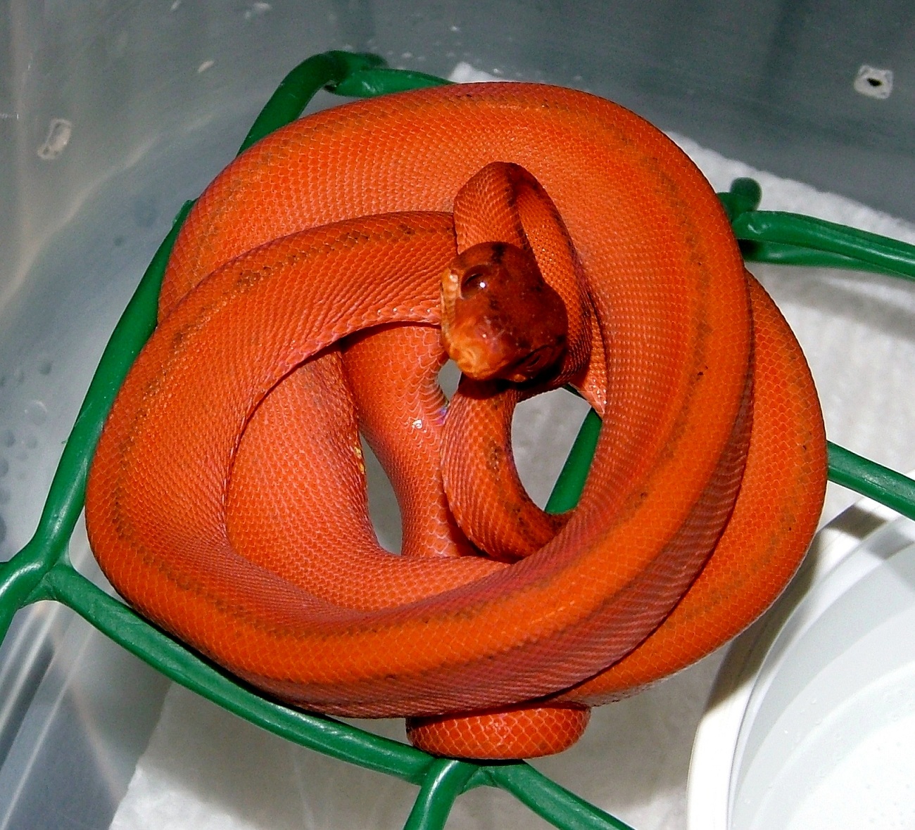 Estos 2 machitos aun siendo rojos por igual manifestaban una notable diferencia ya desde recién paridos y es que uno presentaba un patrón clásico Tiger en melanina con ténues líneas dorsolaterales y patrón cefálico muy reducido, mientras que su hermano resultaba ser un Tiger rojo patternless o prácticamente patternless ya que siendo precisos sí que presentaba unas marcas cefálicas extremadamente reducidas junto con una ausencia total de líneas dorsolaterales.