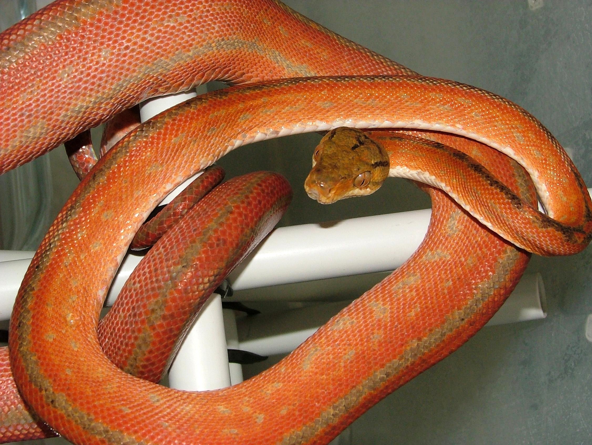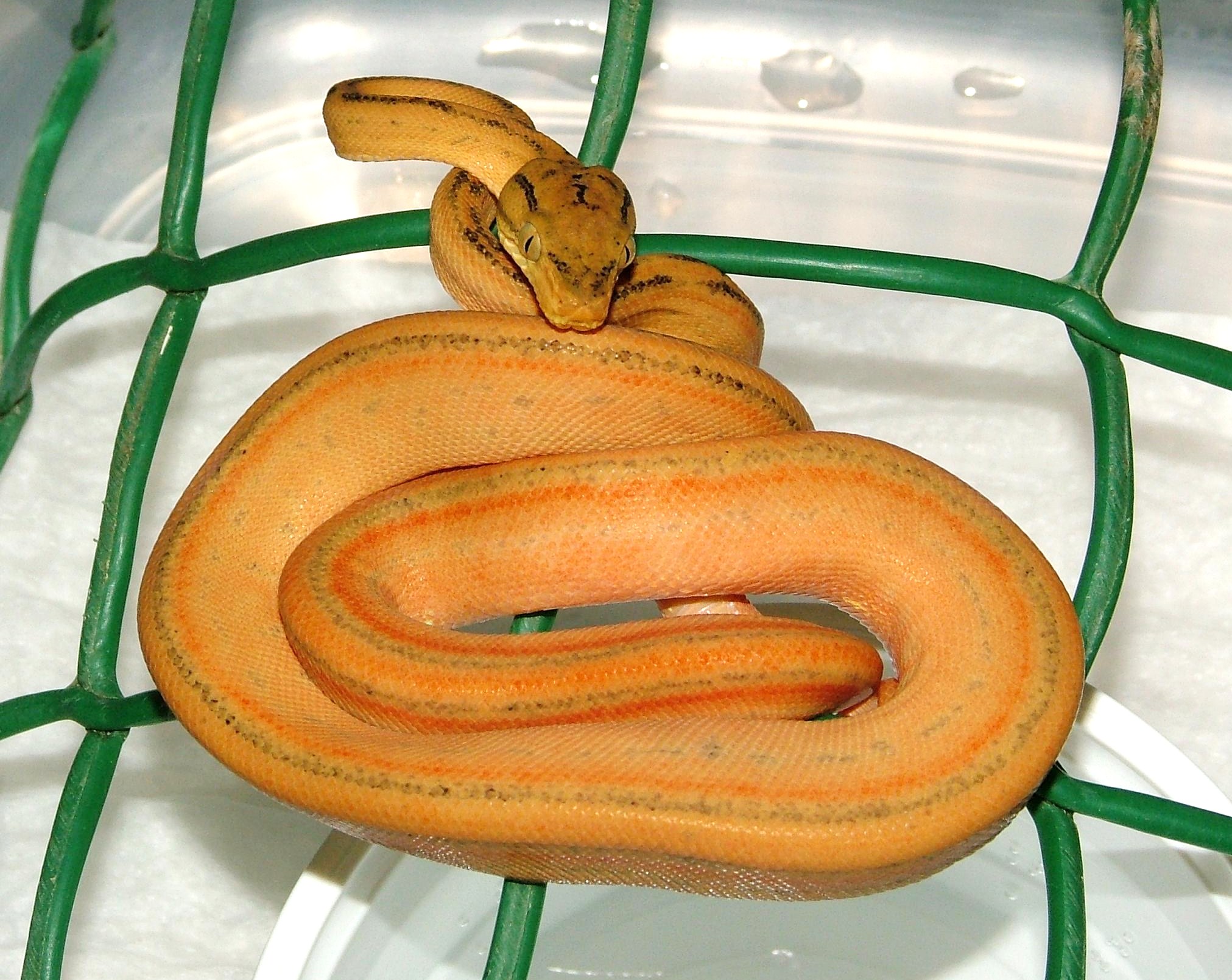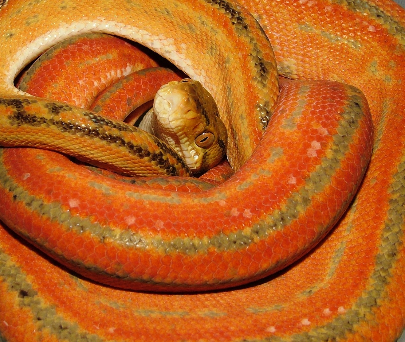 las fotos 2ª y 3ª, de ayer mismo, con 1 año y 3 meses de edad, se puede ver a una hembra colored Tiger clásica en toda su belleza, con un naranja subido de tono que sin duda es totalmente predominante respecto al amarillo y con el naranja salteado con las escamas nacaradas ahora ya mucho más evidentes, algo que ya he podido ver en algunos Tigers de USA y que siempre me había parecido muy interesante.