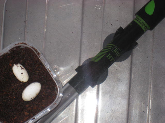 Pues resulta que me compre hace bastante tiempo una hembra HY adulta y la junte con Almo y hoy por la mañana me encontre los huevos fuera del tupper donde tenia la fibra de coco, encima de una cueva , asi que los puse en un tupper mas pequeño con f.c y en una incubadora casera que me he hecho. La incuabadora consiste en un calentador de acuario 20cm de agua dentro de un tupper y encima flotando el tupper con los 2 huevitos. La cosa es que los huevos estan muy bien y con buen color y eso que dicen que las 1eras puestas de una hembra primeriza no son fertiles, pues de momento la mia esta bien ;) .
