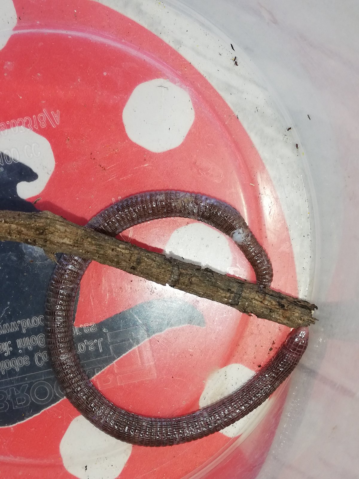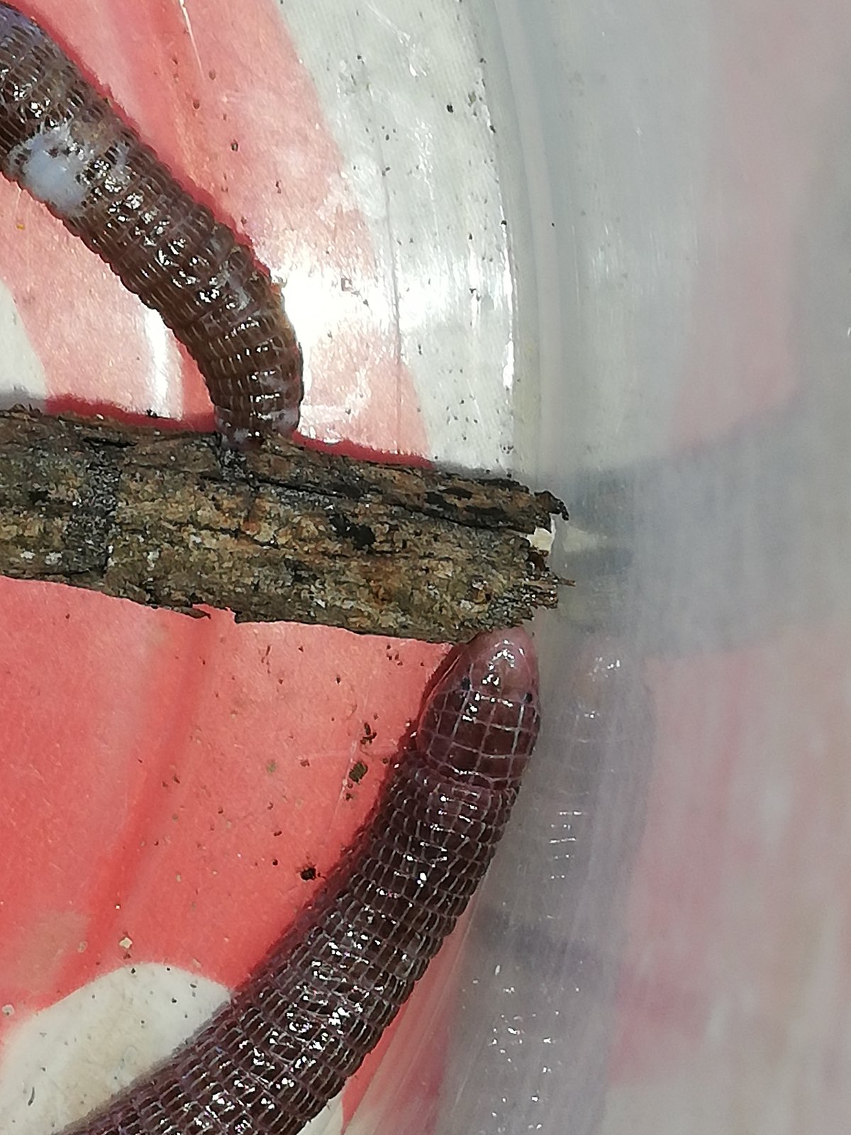 De primeras me ha parecido una lombriz muy grande y gorda, pero después al ir a quitarla de enmedio, se ha enrollado en un palo que había, al tocarla he visto que no estaba húmeda y ha defecado y ha sacado como dos penes, por lo que he comprobado que no era una lombriz. Me ha hecho pensar en una serpiente.