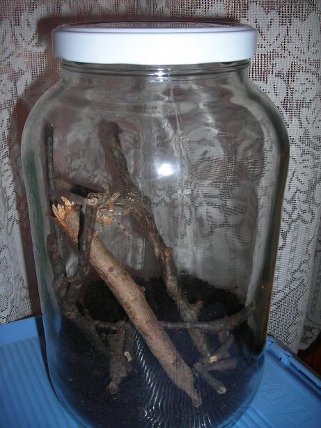 Se que se ve mal la foto de la araña pero de momento no he podido hacer una foto mejor.Este es el nuevo recipiente donde hoy le voy a hacer el terrario.Saludos.