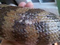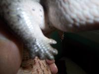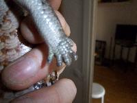 sintomas: posible quemadura en las escamas del lomo, ojos irritados (cuando lo cierra la membrana que protege el ojo se ve roja) los dedos los tiene como deformados o mutilados no lo sabria decir con exactitud. Tambien tiene toda la columna muy deformada.