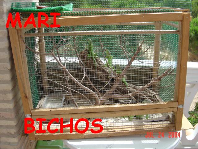 A la pajarera/iguanera la pondre unos buenas ramas gruesas, un semitecho, un gran barreño con agua y la comida en el suelo... la que quiera comer que se mueva...   :cool: