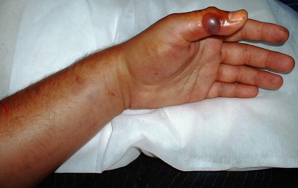 D.D. son las iniciales de este amigo que se encontraba en octubre del año pasado en Omán tomando datos sobre los reptiles de la zona para un estudio, localizo una Cerastes cerastes gasperetti, ya con una larga experiencia , la manipulo como otras veces, para tomar los datos necesarios, pero en un movimiento inusual, el animal consigue aproximar uno de los colmillos a sus dedos, tanto como para engancharlo superficialmente en la piel, al intentar liberarse de la situación con la otra mano, la cerastes lanza varios bocados al aire y consigue morderle de lleno en el pulgar.