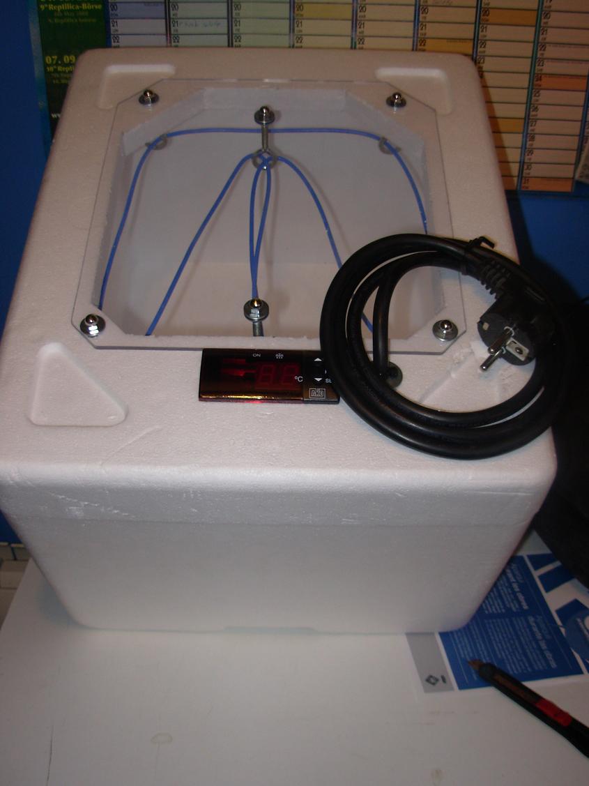 Yo me he hecho una y menos mal que fui previsor, ya que este fin de semana me han puesto huevos. Para hacerla lo saque de esta pagina http://www.manolotrigo.jazztel.es/camaleon-calyptratus-incubadora.htm lo unico que no encontre cajas de esas por ningun lado y la tuve que hacer con una plancha de porexpan. Pero es bien sencillo la verdad.
