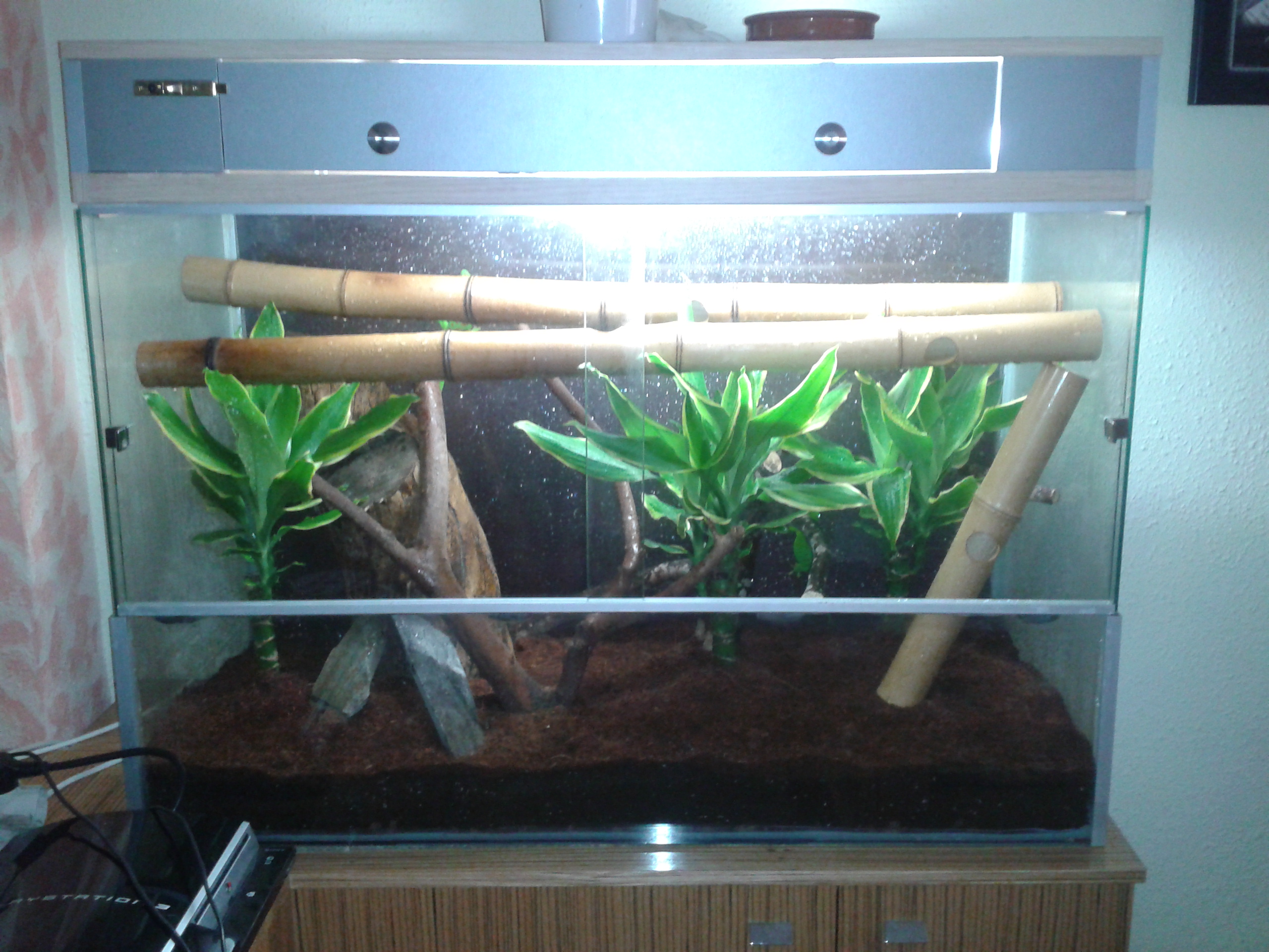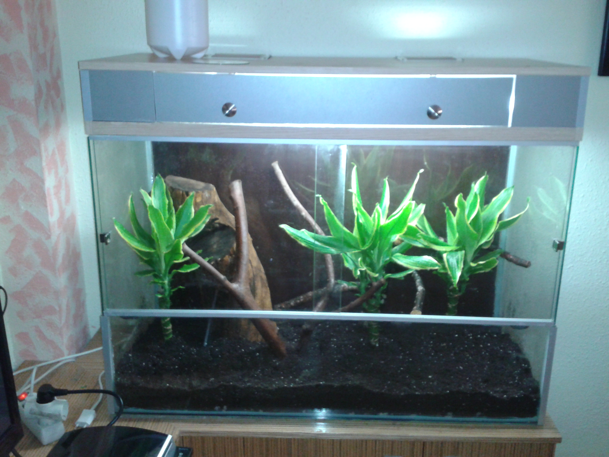 Hola a tod@s.el viernes adquiri una pareja de p. m. grandis.son los primeros geckos diurnos que mantengo.el macho ayer ya hacepto comida de mi mano(papilla un par de grillos y un tenebrio)la hembra no a querido hacerme caso aun.el terrario lo e construido yo y mide 100x50x70 largo x ancho x alto.lo e plantado aunque aun me falta tupir de plantas el fondo del terrario pero en esa zonaa las pondre de plastico.espero os gusten y se aceptn todo tipo de consejos.