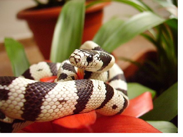 Aqui teneis a la pequeña Lampropeltis que os presente hace unos dias, ya la tengo "comiendo en la palma de mi mano"...
