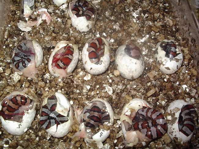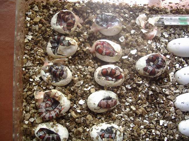 Como partimos de que todos los huevos son incubados a la misma temperatura con pequeñas diferencias entre uno y otro de alguna decima de grado (debido a la distinta colocacion y distribucion de los huevos), eso quiere decir que naceran a la vez, con intervalo de 24 horas como mucho. Cuando una serpiente ha de eclosionar es porque la presion del liquido del huevo junto con la necesidad de mayor cantidad de oxigeno que la cubierta del huevo y sus venas no pueden darle la obligan a empezar a respirar por los pulmones. Cuando una serpiente empieza a notar asfixia, empieza a moverse dentro del huevo presionando las paredes. Ese movimiento y roce provoca que el diente de eclosion rasgue la cubierta del huevo en distintas rajas, hasta que la serpiente asoma la cabeza por una y toma su primera bocanada de aire. Luego se queda dentro del huevo por un periodo de entre 1 y 3 dias en los que va absorviendo los restos de yema del huevo que le serviran de alimento las primeras semanas hasta que mude y caze por primera vez. Durante ese teimpo que absorve los nutrientes es cuando vemos a la serpiente asomando y metiendo la cabeza dentro del huevo. Poco a poco se va sintiendo incomoda y cada vez va asomando mas cuerpo hasta que lo hace del todo y en ese momento se le seca el cordon umbilical y se le rompe quedandole a la serpiente una marca a modo de ombligo. Si nosotros forzamos a la serpiente a salir del huevo antes de que se le desprenda el cordon esta puede morir por desangrarse, por infeccion o por no cerrarsele la herida y cicatrizar.