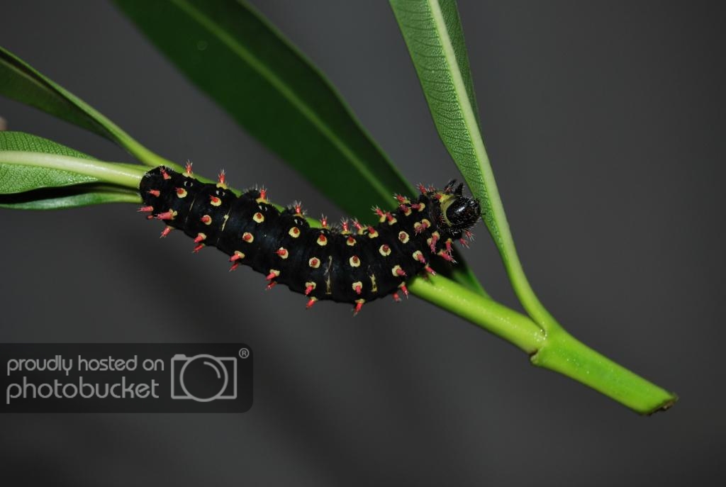 Pues malas noticias!! Desgraciadamente cogi adelfa de donde no debia, y solo quedaron 17 larvas vivas, todas ellas con cagalera y espasmos... Pero como las desgracias siempre vienen a pares, ademas se me cayó un capullo, con la mala suerte de que era el mas blandito y la crisalida de dentro se revento... Asi que quedan 6 gusanos haciendo capullo, que como estaban a punto de hacer capullo no comieron la adelfa mala y estan sanos. Y de los 17 gusanos que quedan, están cayendo poco a poco casi todos, a ver si alguno mas hace el capullo y saco unas cuantas adultas que me pongan huevitos!!!