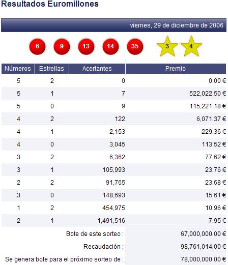 Bueno pues aunque sea con 70-80€ (aun no lo he llevado a comprobar) en lugar de 300€ la ilusion continua.... (las probabilidades son casi las mismas) por mi deacuerdo en jugar el importe de los premios para el euromillon de este viernes (no hubo ganador de primera asique el pellizco puede ser importante: 78.000.000 €!!)