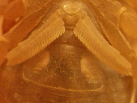 Pues nada por fin he pillado a uno de mis dos Buthus pegadito al cristal y le he podido hacer una foto de los pectenes, ahora haber si me decis si es macho o hembra.