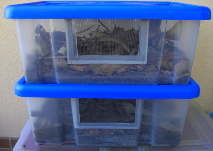 Bueno... eso de recinto es un decir, de los artrópodos que mantengo y crío son de los que gozan de más espacio. De momento tengo dos parejitas, que si todo va bien ampliaré a 5.