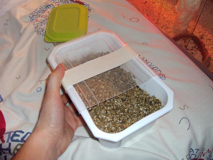 Primero de todo se coloca un recipiente en el terrario para que la hembra entierre los huevos, de aqui se sacan varias cuestiones.