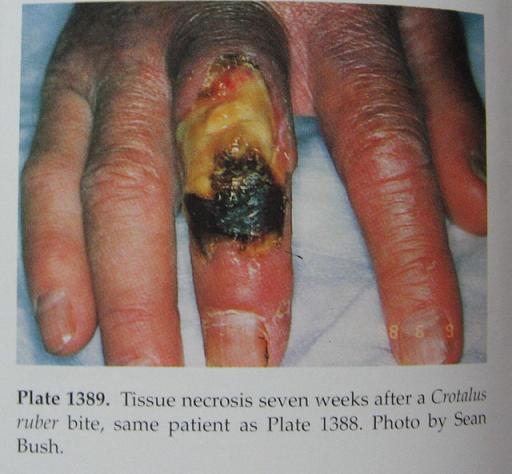 http://www.rattlesnakebite.org/rattlesnakepics.htm muy grafico de lo que puede hacer un crotalo ( cascabel ) de tan solo 150 cm de largo.
