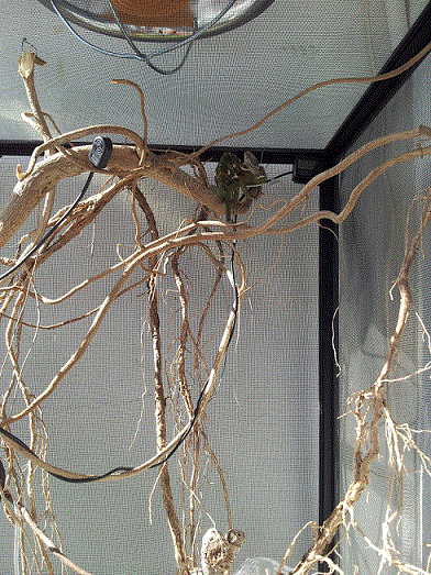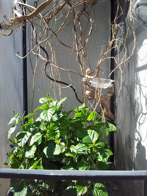 Os envío algunas imágenes del animal y el terrario. Lo que estoy buscando es alguna planta colgante o enredadera de exterior que le venga bien. Cualquier consejo que me deis por añadido, bienvenido será, es el primer reptil que mantengo en cautividad.