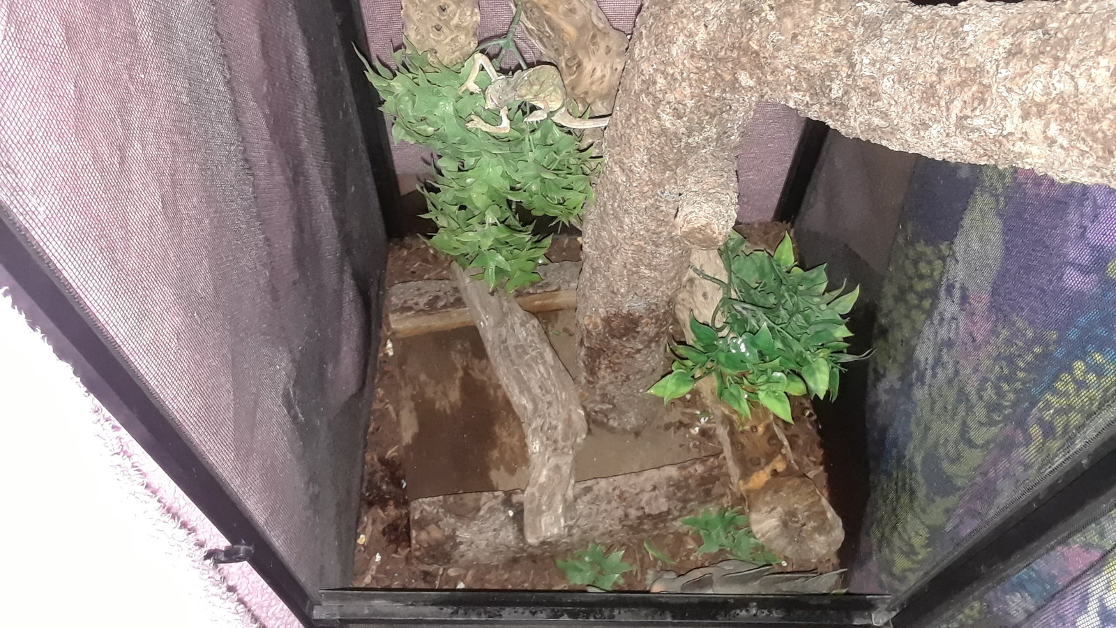 En cuanto a las recomendaciones que me dieron, consegui un super duper pack de articulos en los que se incluian varios tipos de focos (aprox unos 6), alimento (orugas de seda, grillos cucarachas...). Tambien le consegui un terrario mucho mas amplio sin Mucha altitud como me recomendaron y con el plus de un sistema de lluvia.