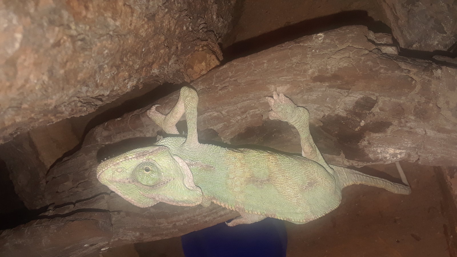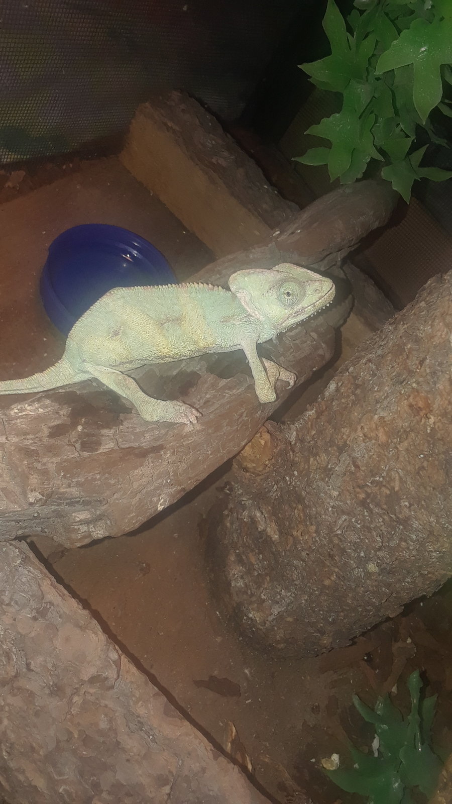 Hola buenas noches, no quiero desanimarte pero ese cámaleon esta muy muy mal tiene emo y totalmente deshidratado, además con ese tipo de iluminación seguirá estando igual de mal, no te sirve una bombilla cerámica ni la otra bombilla incandescente, los camaleones necesitan un buen punto de calor y radiación uvb si no le pones rapido una bombilla potente de uvb, le hidratas y nutres con una buena base, no vivirá mucho la verdad