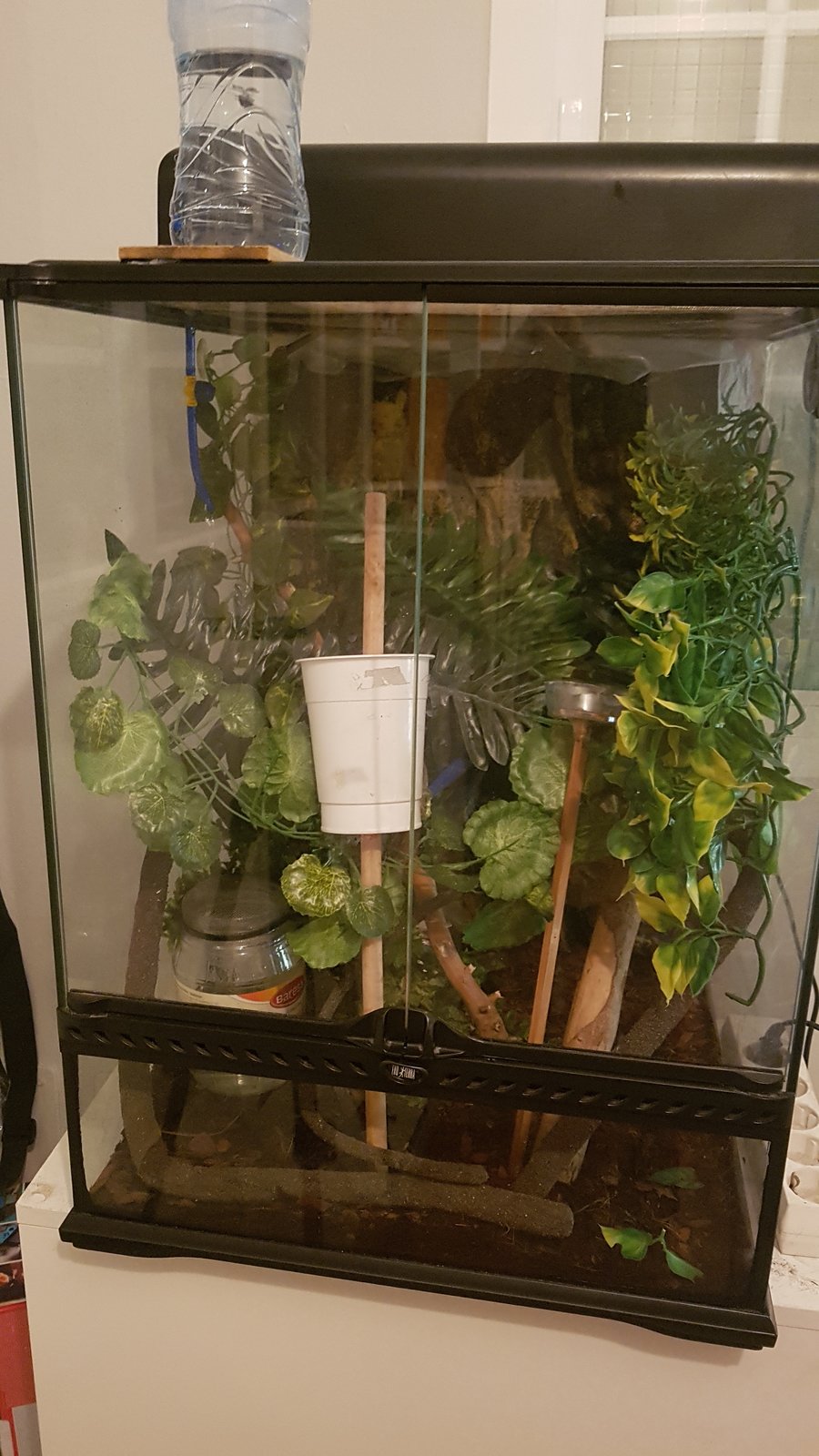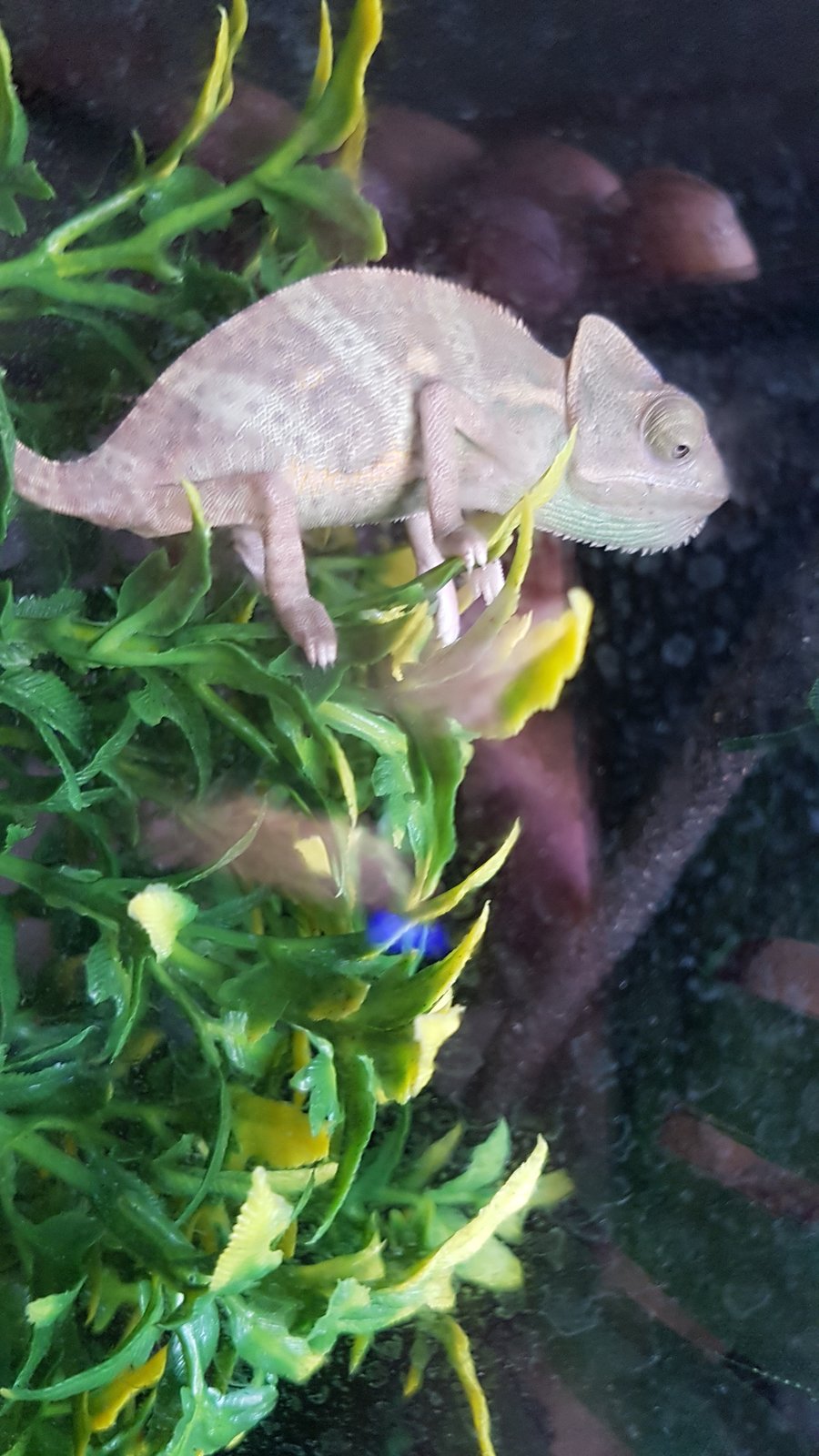 Hola, buenas noches, me llamo Carlos, soy de la provincia de Cádiz, y llevo poco tiempo en este mundo de los camaleones, es totalmente nuevo para. Pues compre hace un par de meses Un Calyptratus de unos dos mesecitos según el de la tienda, lo tengo en un terrario Exoterra de 45-45-60, con plantas artificiales, termometro, higrometro, un gotero casero, hecho con una botella de litro situada en lo alto de la rejilla con una tabla para que no hunda la rejilla y una válvula de riego por goteo, también un vaso de plástico para poner los grillos y los pueda coger fácilmente desde las plantas. El terrario lo tengo en una habitación de casa porque no tengo otro lugar, es un piso. Espero poder aprender y que se haga todo un hombretón mi camaleon jejejeje.