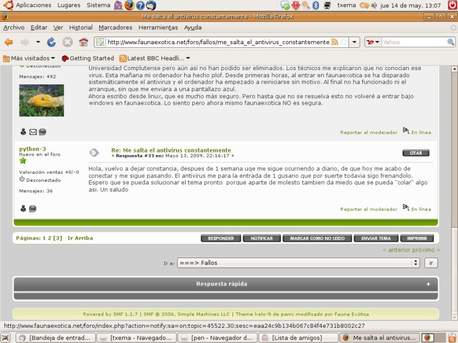 02/05/2009 13:22:40 Filtro HTTP archivo http://cximnik.cn/img2/cache/readme.pdf PDF/Exploit.Pidief.NZM Troyano conexión finalizada Morgul1\Morgul Se ha detectado una amenaza accediendo a un sitio de Internet a través de esta aplicación: C:\Program Files\Mozilla Firefox\firefox.exe.