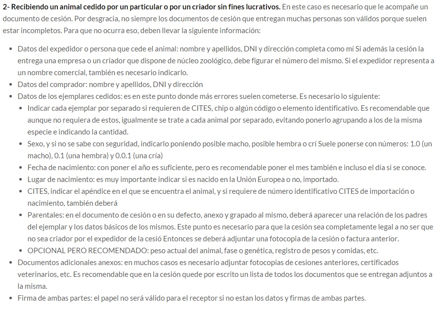 Buenas, solo me gustaría saber un dato, era un requisito que el animal estuviese gravita? arreglasteis un precio diferente por que la hembra se encontrase en estado? Yo personalmente no compraría un animal próximo a una puesta, imagina que tenga retención de huevos o que llegue a tu casa con carencias de calcio etc, el vendedor te advirtió del estado del animal y además te ofrecía la devolución del dinero, creo que lo más inteligente por tu parte seria no comprarlo o devolverlo en su momento, al menos el animal llego a tu casa bien no? Por cierto, eso de lo del documento de cesión suele ser normal, eso de conseguir un documento de cesión que se ajuste totalmente a la legalidad es muy difícil, normalmente muchos ni siquiera entregan un documento de cesión ni nada, esa es la realidad de los particulares, la mayoría no tiene ni núcleo zoológico, ni certificado de criador, ni certificado veterinario de cría en cautividad ni nada, tampoco es una práctica tan extraña, si quieres documentación legal, te tocará cómprarlo en tienda, que al final es lo mismo porque ese animal vendrá de un particular y la tienda lo único que hace es expedir la factura y por ello cobrarte el doble de lo que vale, un saludo y espero que el animal al menos este bien y que lo disfrutes durante mucho tiempo, suerte