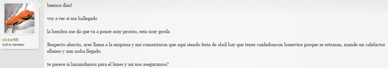 He adjuntado una imagen en la que el vendedor me dice que la hembra está muy gorda y que pondrá pronto,(ese mensaje fue escrito 21 días antes de la llegada la hembra) claro está que cuando llegó ya no estaba gorda como el decía ni ha puesto pronto.