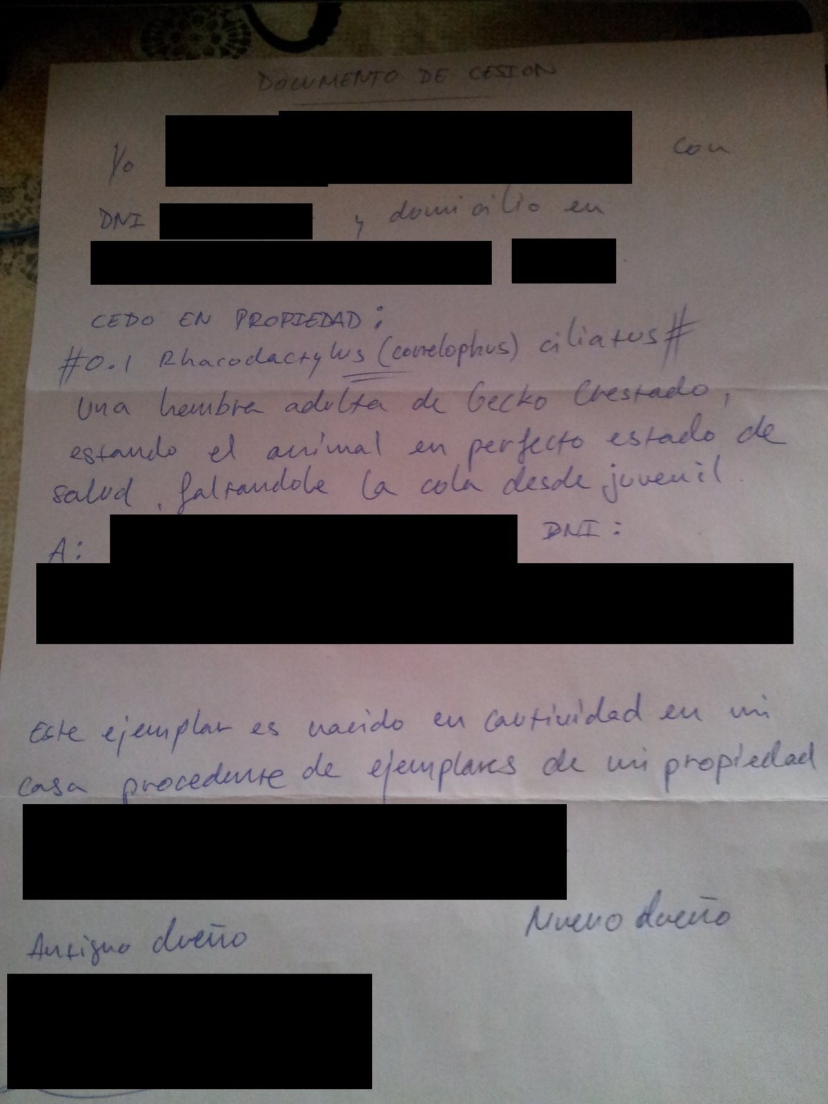 Bien, el día 3 de Julio (2 meses y medio después del pago) me han llegado los "supuestos" papeles en regla y de traspaso y el regalo por las molestias (unas semillas de semillas de madre de miles , una planta que se usa para decorar piedra , vayas , jardin,etc y que no voy a poner en mi terrario, considero que es como si te compras una moto y el vendedor te dice que te va a regalar algo y te regala una rueda de coche pero bueno, me da igual ya) y a día de hoy la hembra sigue sin poner huevos por lo que ya es imposible así que he decidido juntarla con el macho de un amigo. Los papeles están a mi entender incompletos y encima en un papel escrito a mano, se lo he dicho, diciéndole que le falta la fecha de nacimiento de la hembra(aunque sea solo el año) y de dónde viene, es decir, los datos de los padres de la misma o el papel de cesión anterior si no ha nacido en su casa a lo cual me responde diciéndome que están bien los papeles(un folio escrito a mano) que me ha mandado.