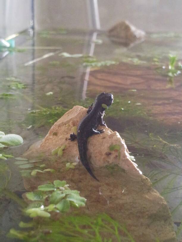Hay criadores que no les hacen pasar la fase terrestre por la complicidad al darles de comer, yo por ahora lo tengo en 5 mm de agua y cuando metamorfosean los demás iré subiendoles el agua y se lo plagare de plantas, ayer mudo de piel y todo, pero no quiere comer aun.