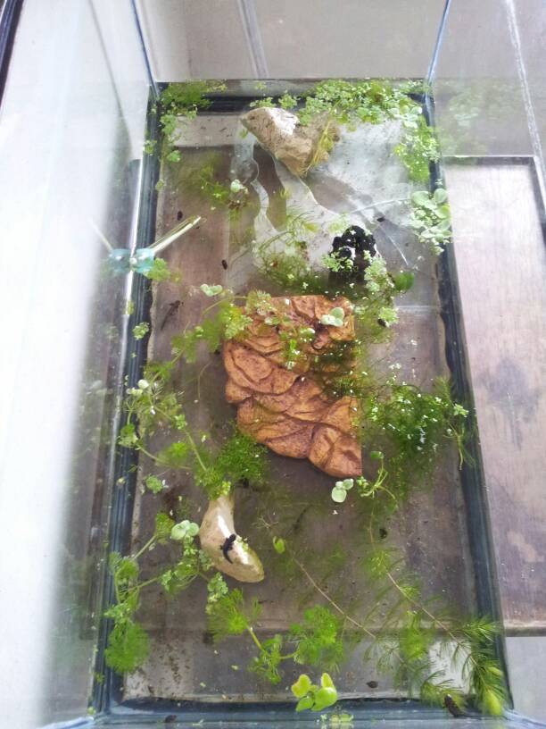 Asi con agua y plantas mantengo yo juveniles de otra especie y ya estan empezando a bucear, yo creo que es comodo y no les hace mal, pero bueno si ves mejor darle tierra tampoco lo veo mal.