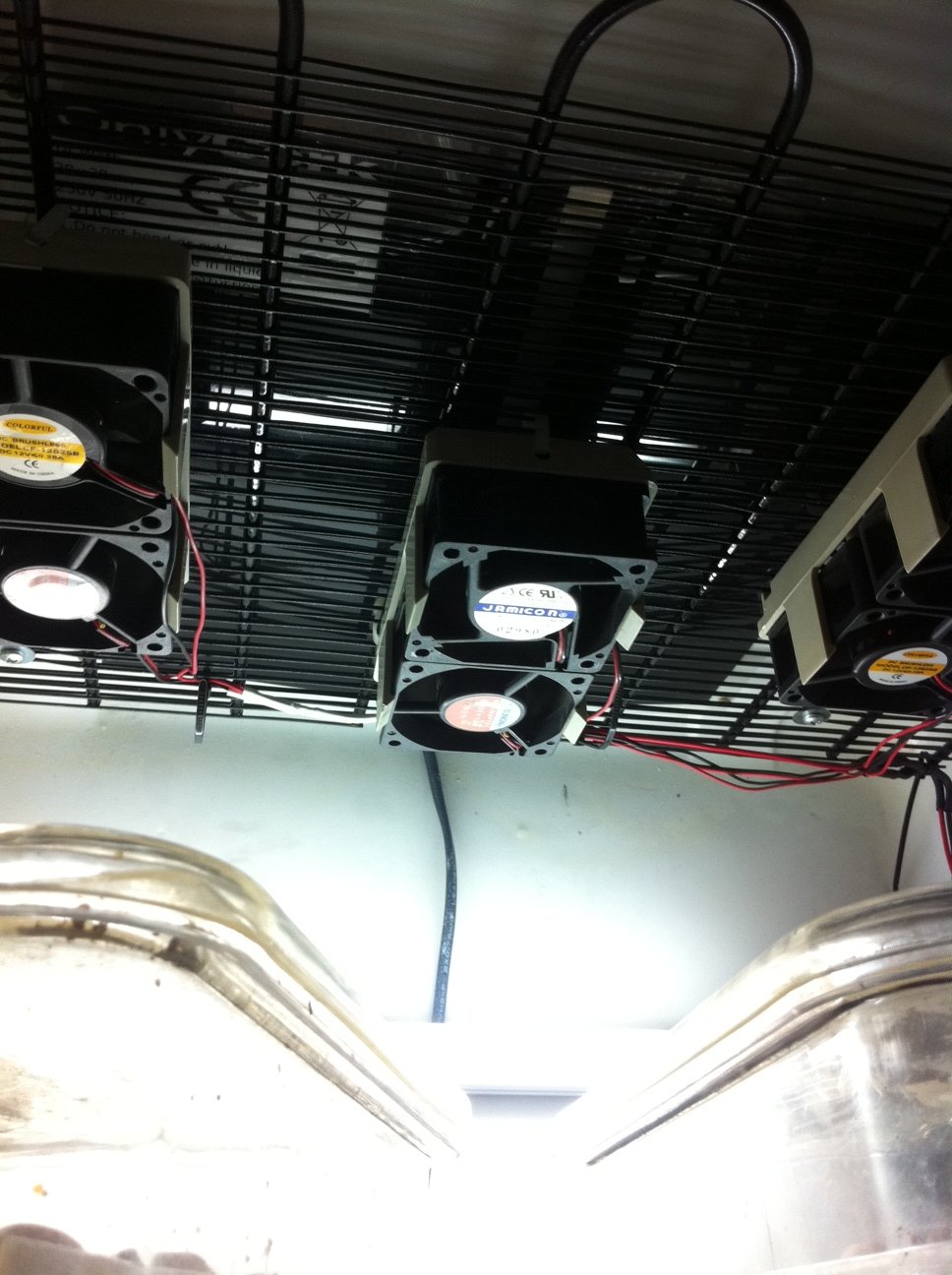 En la foto de las sondas de la temperatura se aprecia también al fondo los taladros por los que entra el aire del exterior para la renovación (ventilador muy potente conectado a un temporizador) y la calefacción inferior.