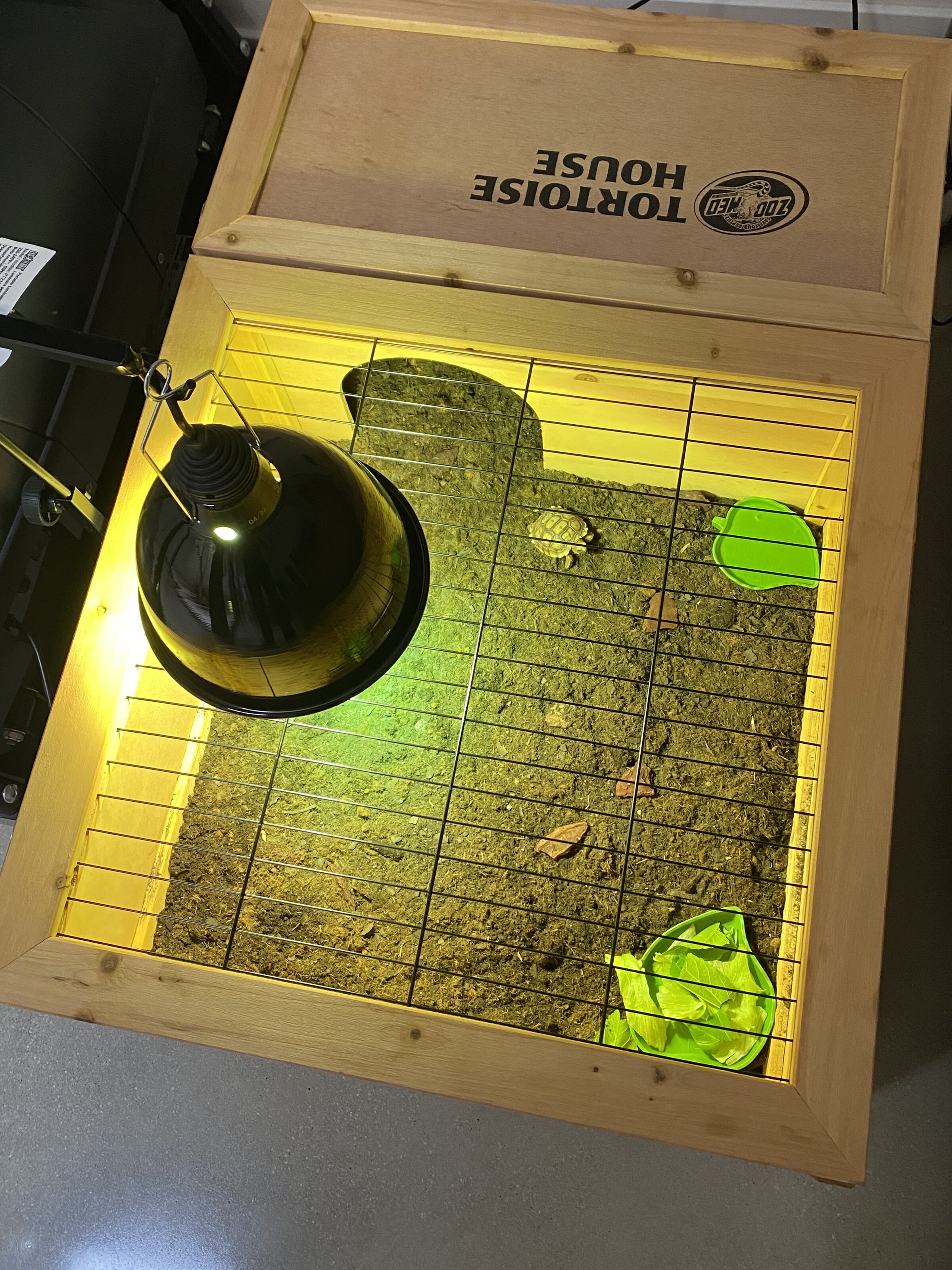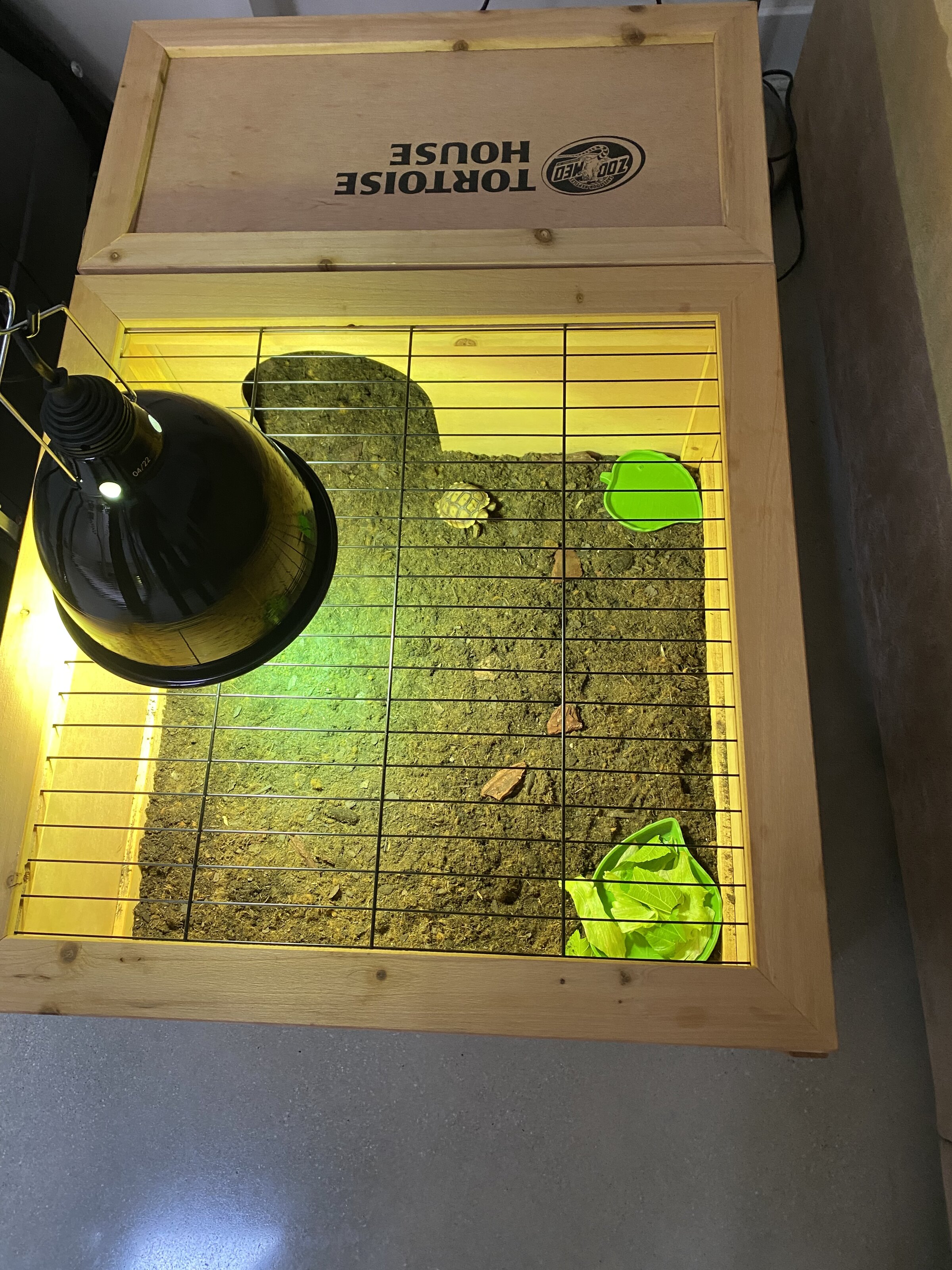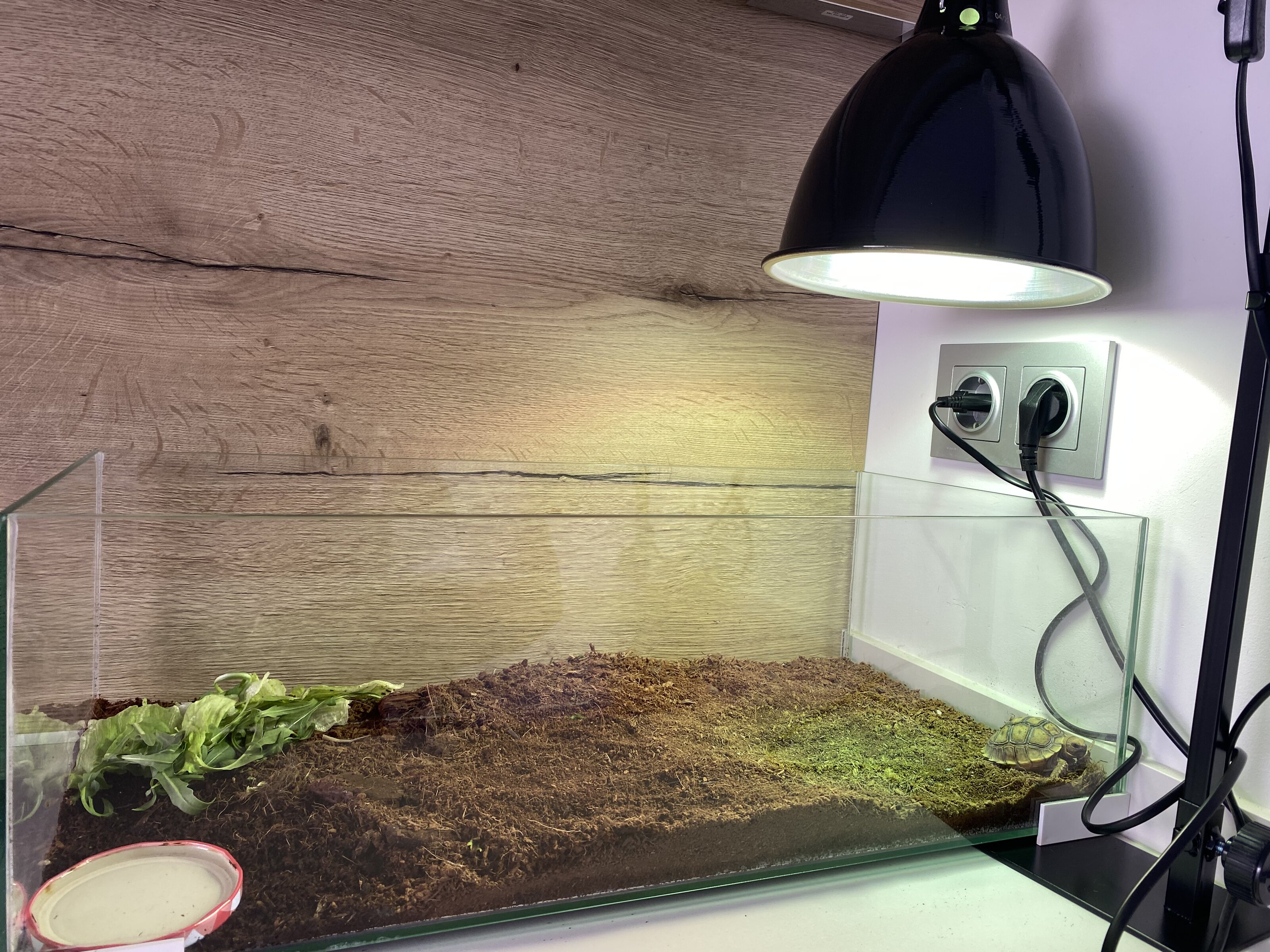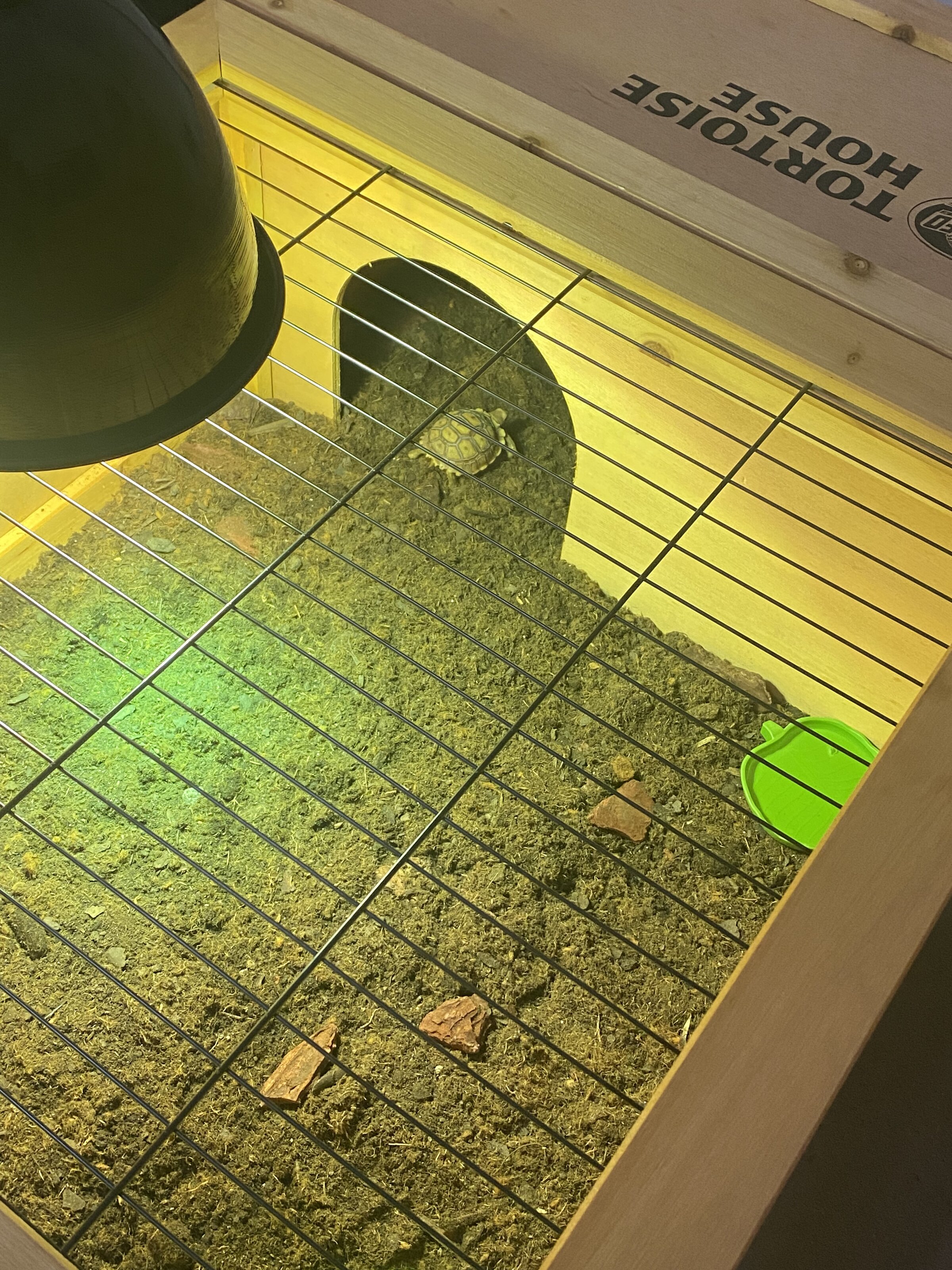 Adjunto fotos de la tortu y su casita para que la veáis con la luz. Tengo pedida una mini cueva para que se refugie también; y tengo pensado tener una zona humedecida también.