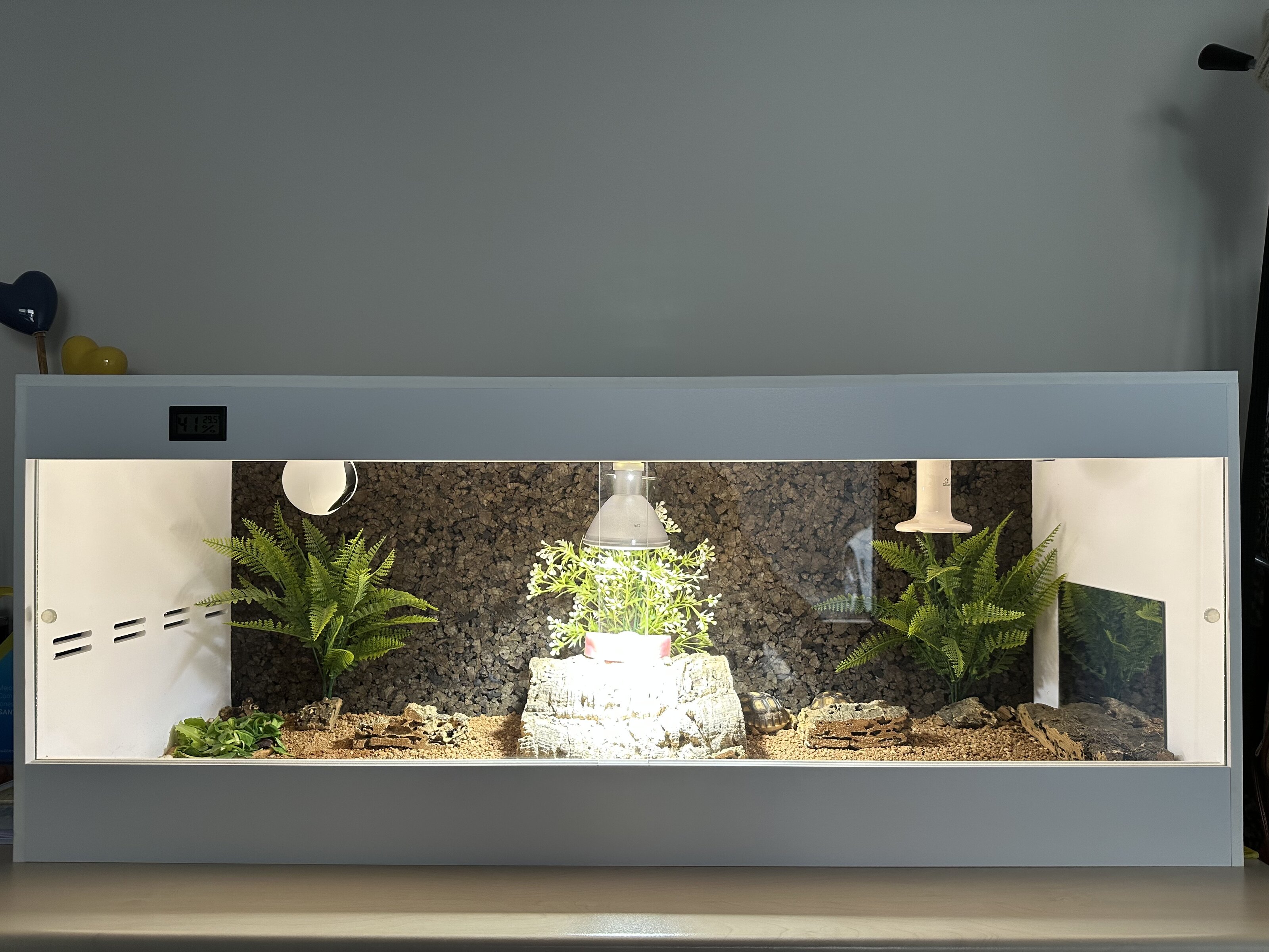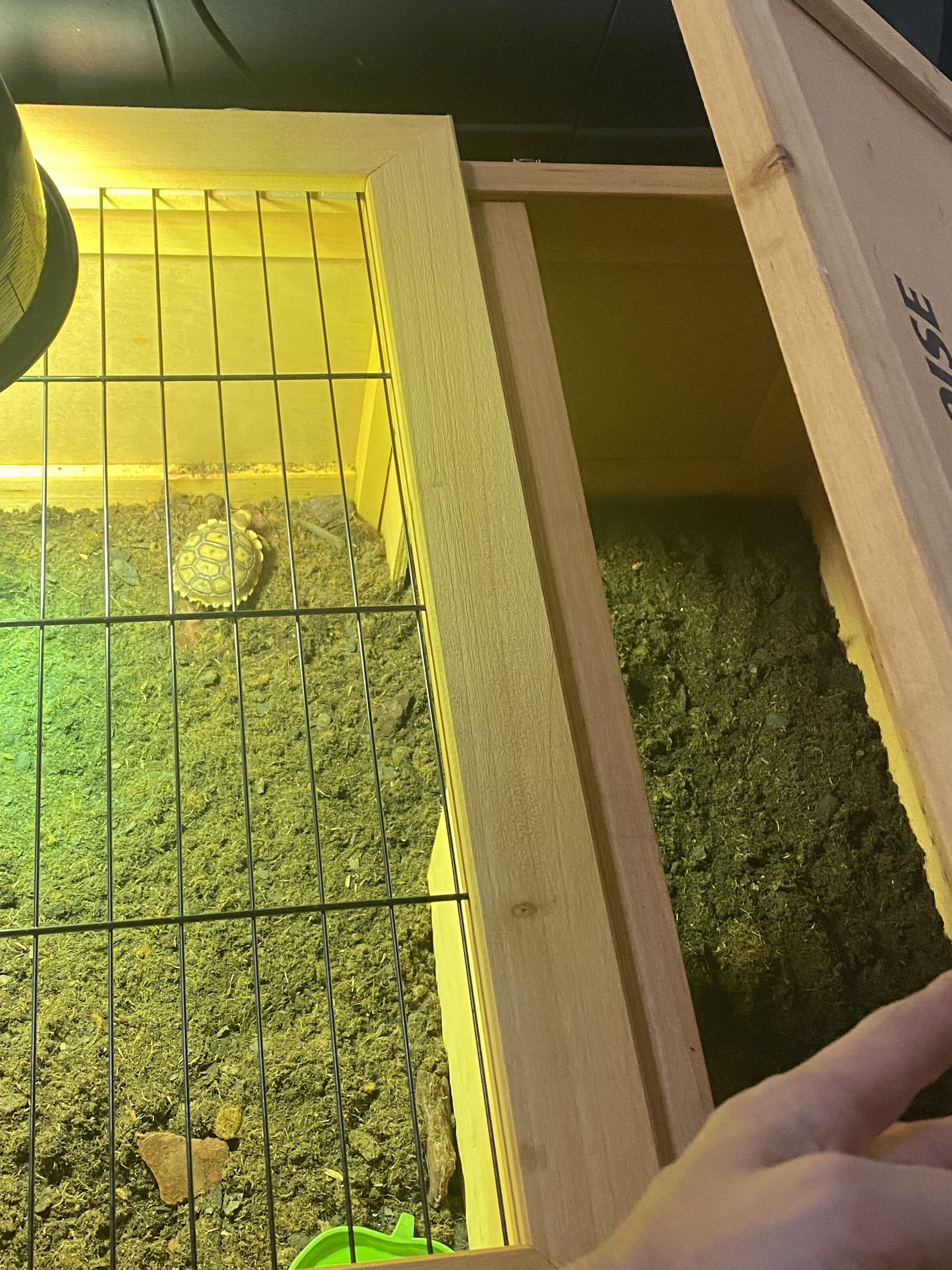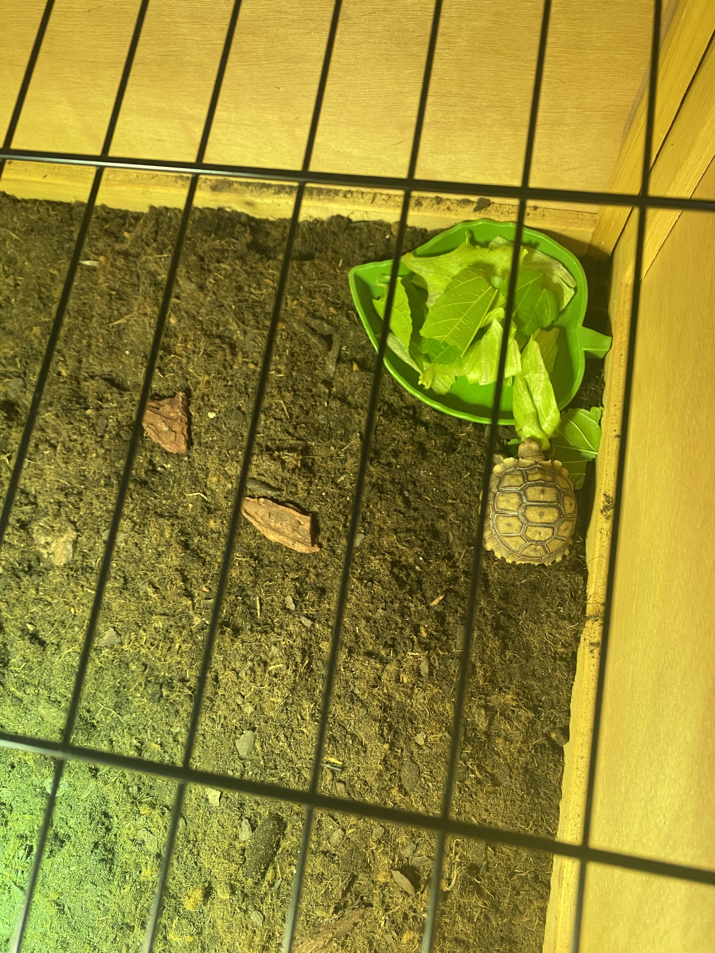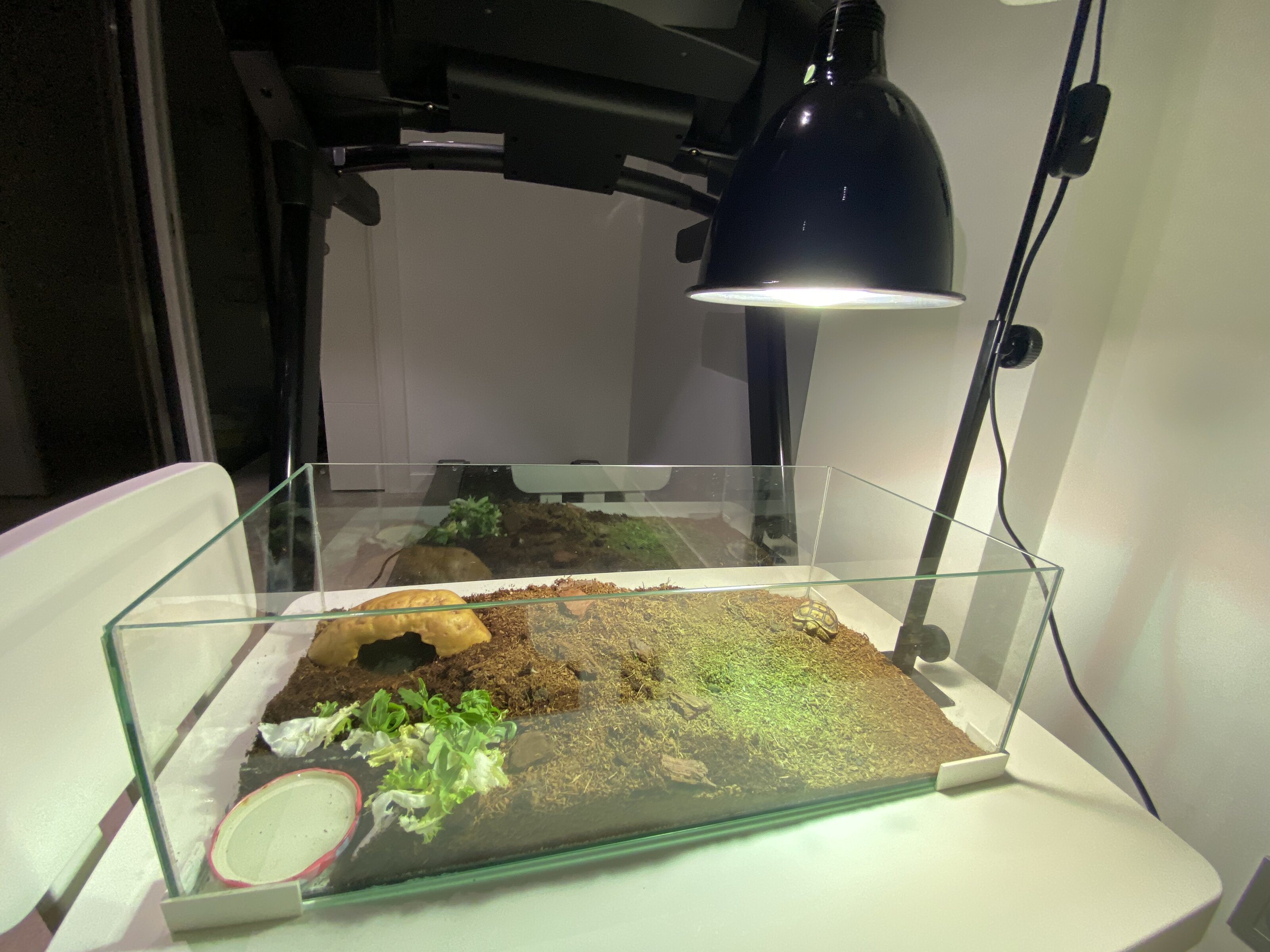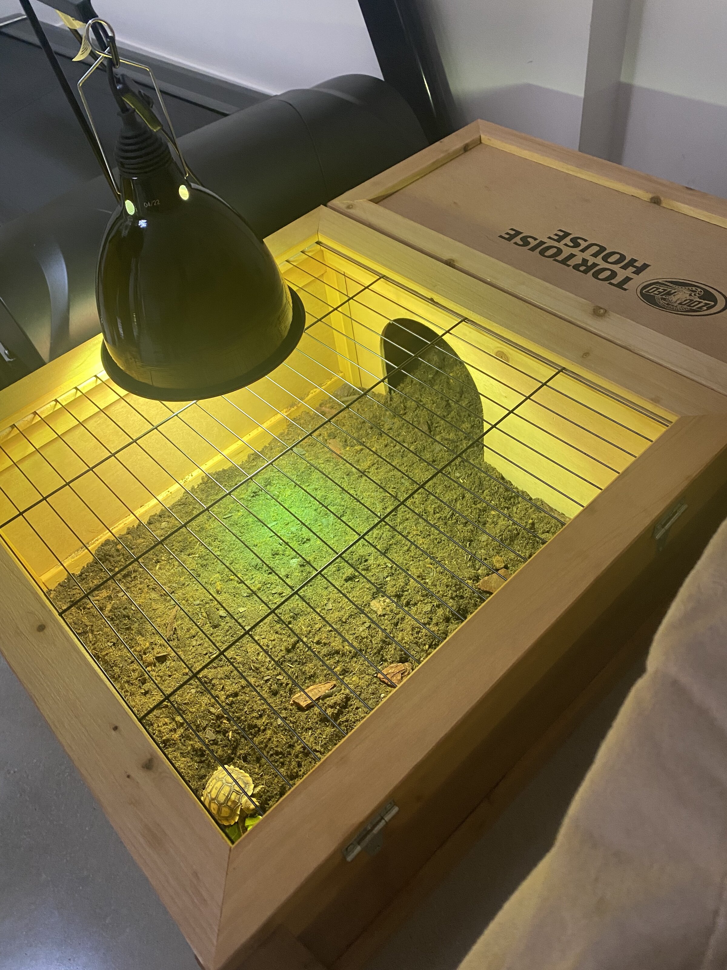 Adjunto fotos de la tortu y su casita para que la veáis con la luz. Tengo pedida una mini cueva para que se refugie también; y tengo pensado tener una zona humedecida también.