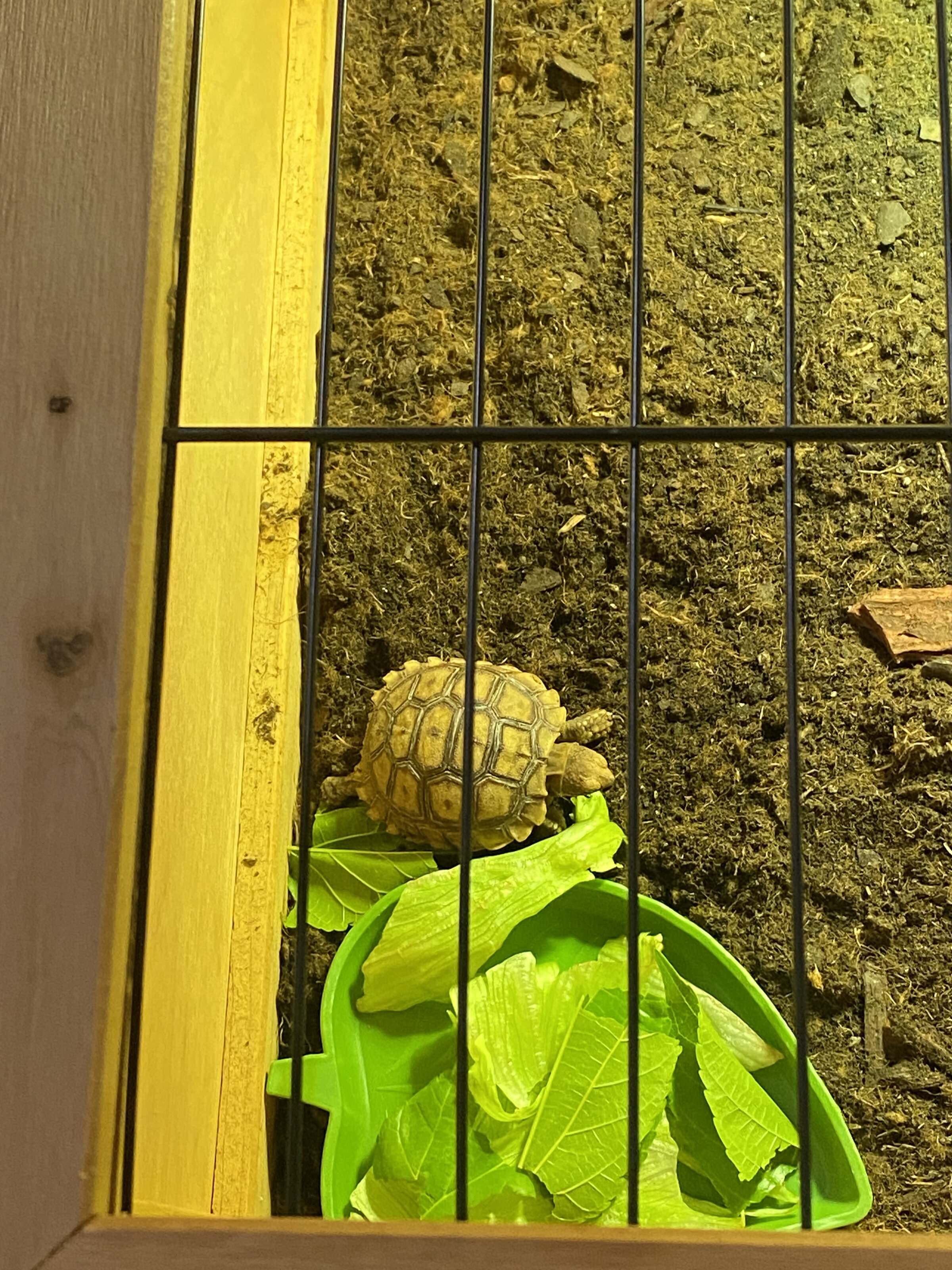 Para mí lo mejor para una sulcatita pequeña es un lecho de paja o heno siempre fresco ya que también lo usará de alimento y la zona de reposo con fibra de coco húmeda.