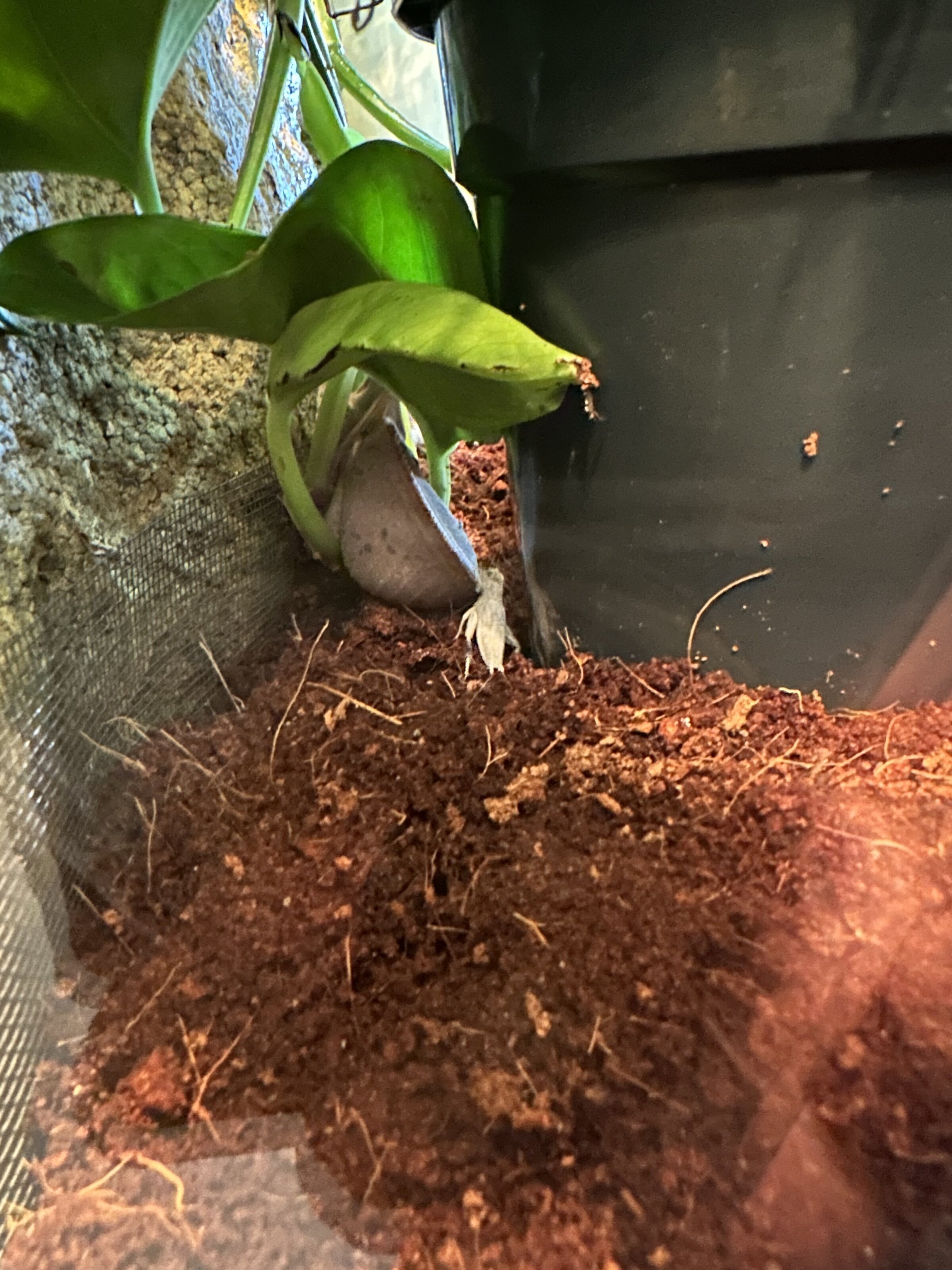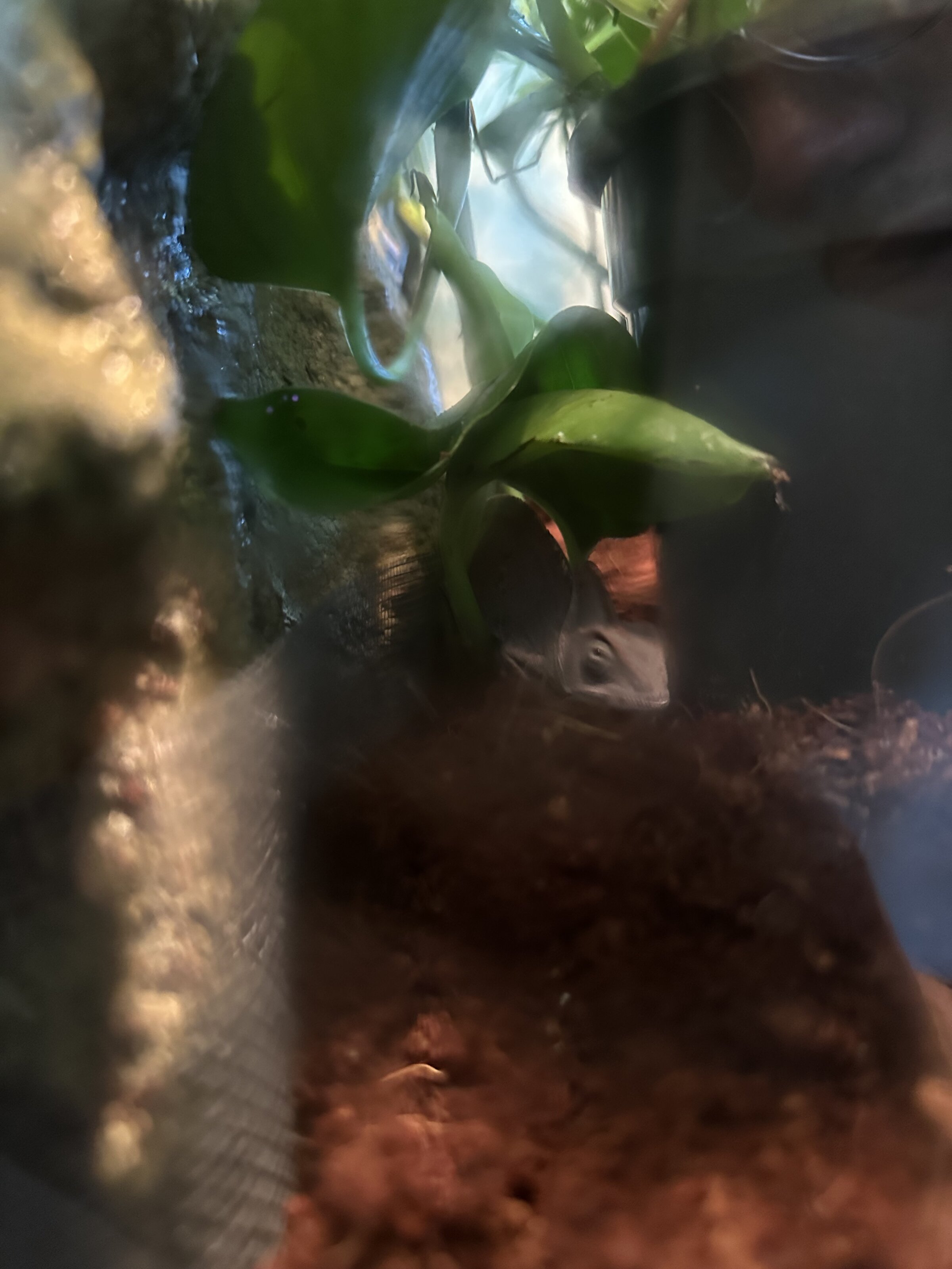 El terrario está a 70 de humedad o un poco más (le subí o un poco porque le vi como los signos de deshidratación en los agujeros de la nariz), y de temperatura está a 30 arriba y abajo a 22. Adjunto unas fotos por si pudieran ayudar.