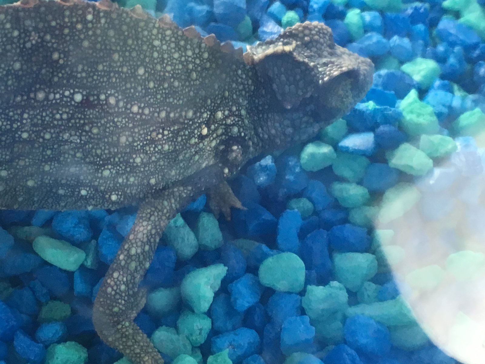 Hola , esto es un poco raro todo....tu camaleón es el de la foto?. Si es así, a mi me parece una hembra de chamaeleo jacksonii xantholophus, y no de un mes y medio precisamente sino adulta. También parece estar deshidratada porque aunque no se ve bien los ojos parecen hundidos.....y ese sustrato que tiene, mala pinta da.... Ponnos detalladamente como la mantienes, como es el terrario ( si es de malla o de cristal), medidas del terrario, decoración, humedad, y temperaturas de día y de noche, si le das suplementos de calcio y vitaminas y cada cuanto, y que iluminación tiene. Lo mas importante en esta especie es el tema de las temperaturas, por la noche que no pase de 15°C, o como mucho de 18, y por el día de unos 25, pero no más. Intenta poner también otra foto que se vea mejor, sobre todo lo de la pata, y los ojos.