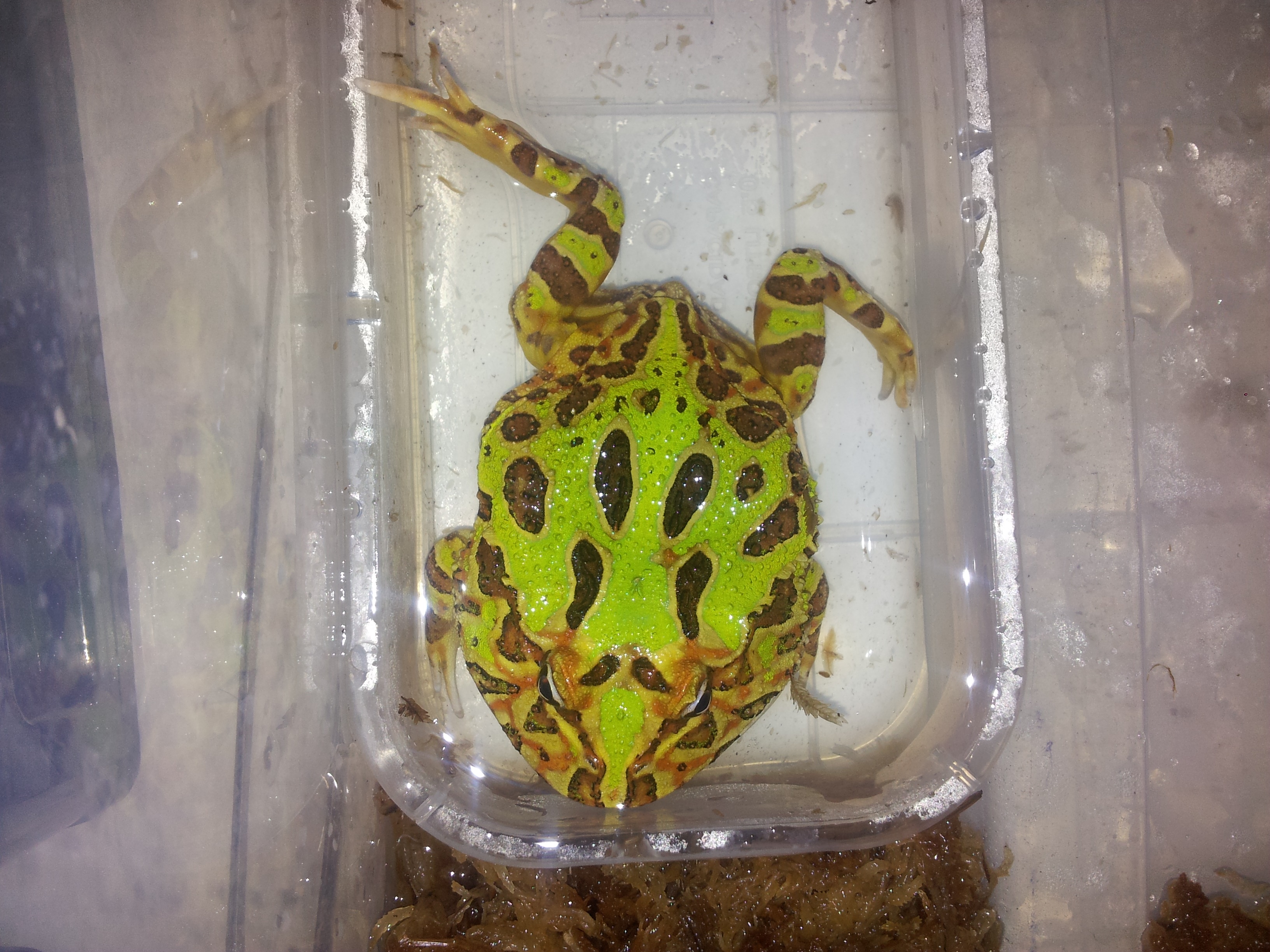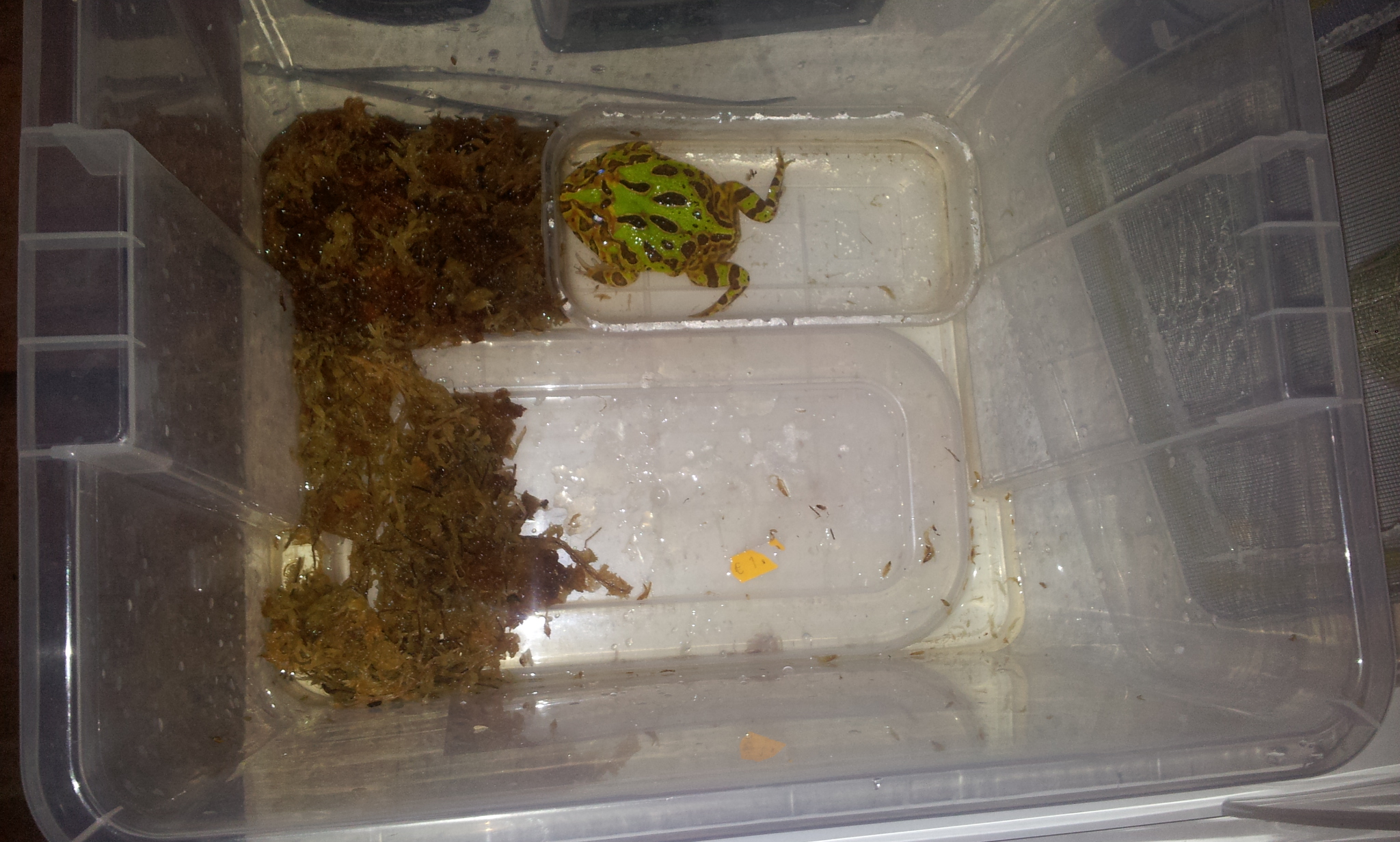 Os presento a mi rana, espero que me echeis una mano a identificarla, sexarla y a darle mejor vida. Mide 8 centimetros y pesa 61 gramos. La alimento dia si dia no con 3 grillos adultos o dos cucarachas, una vez al mes le doy un pinky de ratón seguido de 5 dias de ayuno. Lo tengo en un tupper de 20x40 centimetros, con sitio de agua, otro con spagnum humedecido y otro seco y duro; usa los tres. Recientemente he leido alguna cosa que me hace pensar en montarle un terrario y ahi empiezan un monton de dudas, he visto reportajes y me parece que es una especie muy acuatica con lo que creo que mas del 50% del terrario deberia ser agua. Que tipo de iluminación?