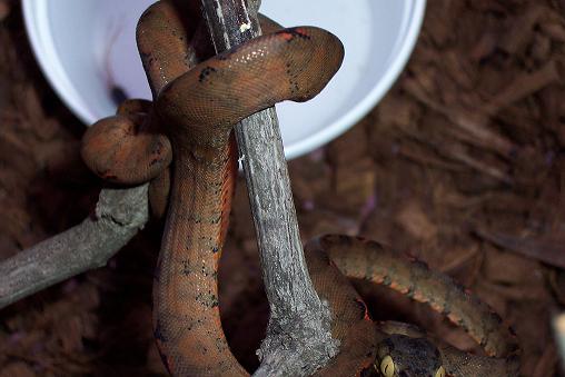 Sobre el tema alimentación, no cuentas como le das su comida. Así que te comento unos truquillos posibles, a ver si te mejora. Con su tamaño, deberías darle fuzzies de ratón con pelo, no le ofrezcas presas demasiado grandes, la hortulanus no gusta de grandes comidas, incluso mejor 2 presas pequeñitas que 1 presa más grandecita. Prueba a darle a última hora de tarde o de noche, con poca luz, la presa muerta con pinzas largas, moviéndosela delante de la cabeza, si se presenta a la defensiva es mejor, la morderá con más ganas, y si tu corallus está algo adormecida o aburrida, anímala tocándole ligeramente con la presa en el morro y en un costado, pero suave para que no se intimide demasiado. El mejor truquillo con las hortulanus, la temperatura de la presa, si son reacias a comer, calienta previamente el roedor recién muerto o descongelado en un punto caliente como un foco, bombilla cerámica, etc... durante un ratillo, que no se le chamusque el pelo, pero que quede suficientemente caliente, y la excitación de las fosetas térmicas de tu hortulanus hará el resto, no debería fallar.