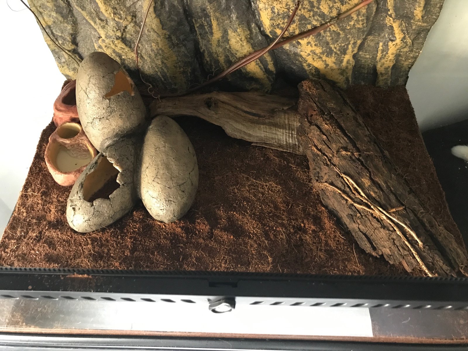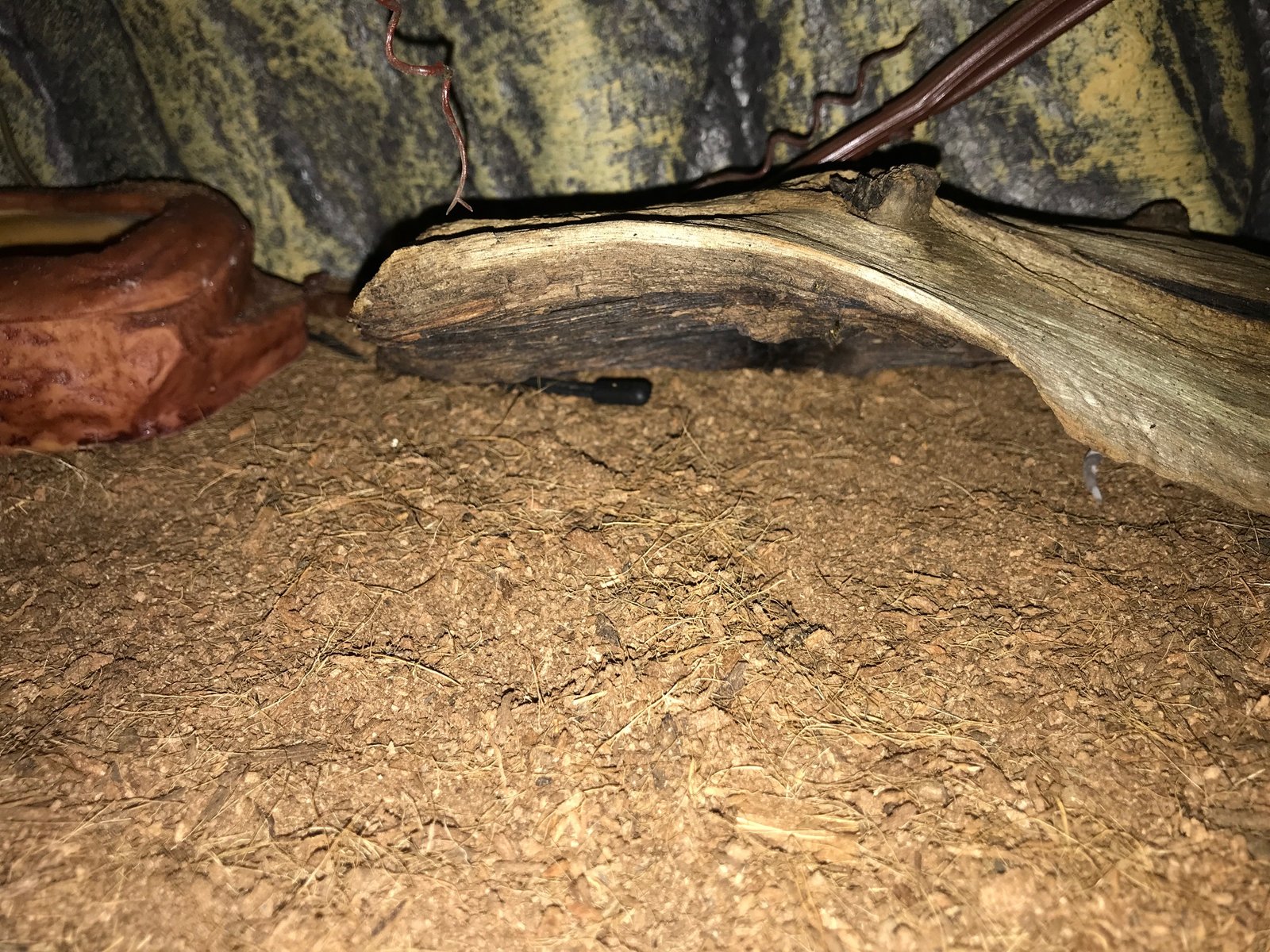 Para poneros en situación, el terrario es de exoterra 60x45x45 con una luz nocturna y una manta eléctrica exoterra de 25 w pegada al cristal por abajo regulada por un termostato entre 31 - 33 grados. El tema es que no se si estoy poniendo bien la sonda, o que la manta es una mierda, o que no calienta rápido por seguridad. El tema es que para 25 w que tiene, como no ponga la sonda donde la ves en la foto, le cuesta llegar a esos 33 grados. Yo cuando pongo la mano no me da mucha sensación de haber 33 grados. El sustrato es fibra de coco. Os adjunto fotos.