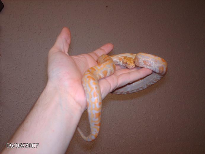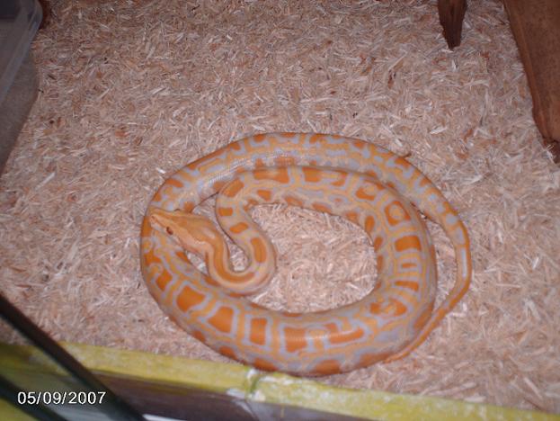 ya esta aki la Python Molurus Bivittatus hembra criada po Molurus jejeje ahi van unas fotillos de la peke jejejeje todo genial molurus ya a comido y todo jejeje menuda bicha