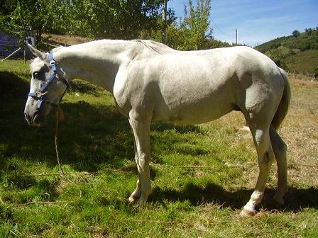 Buenas,este bicho me llego el 2 de agosto.Es una yegua hispanoarabe de 6 años de edad color tordo.Es muy mansa y en agosto montaba casi todos los dias.Al principio estubo un poco rara espeto a m i hermano y a un amigo con unos robles xd tambien la acababan de separarla del potro.Un dia tambien s epuso rara pues estubo 5 dias con otro caballo un macho de raza gallega y cuando mopnto mi hermano se le subio por una pared.A mi nunca me paso nada y fui el que mas monte aun que al principio no tenia ni idea de como llebarla monte y en 15 minutos aprendi aun que siempre se mejora y cada caballo es un mundo ai que conocer bien su comportamiento para saber actuar o como llebarla.