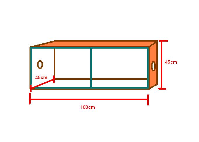el terrario en cuestion va a ser para pogonas como ya veis en el esquema va a madir 100x45x45 el material que voy a utilizar va a ser aglomerado que en su momento varnizare para que el calor o humedad que despida no lo termine degradando mi idea es hacer dos orificios en los laterales de 5 o 6cm de diametro para le ventilacion del mismo... los agujero seran cubiertos con malla metalica.