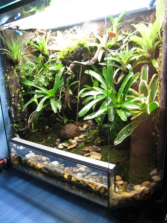 Respecto a cuidados...basicamente ninguno, tener un programador para la iluminacion (12h) y conectado a su vez a un radiador de aceite con termostato (de modo que la temperatura oscila entre los 22,5º y los 27º), un programador por minutos para la lluvia (5 veces al dia durante 1 minuto), y la bomba de la cascada conectada directamente todo el dia y la noche...