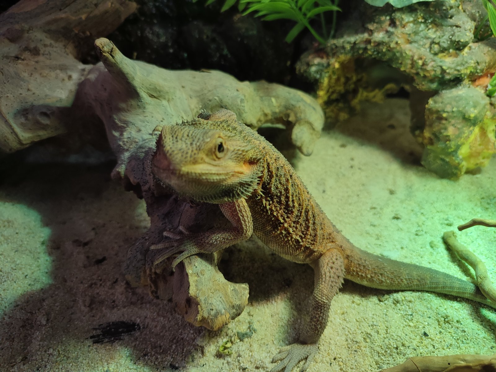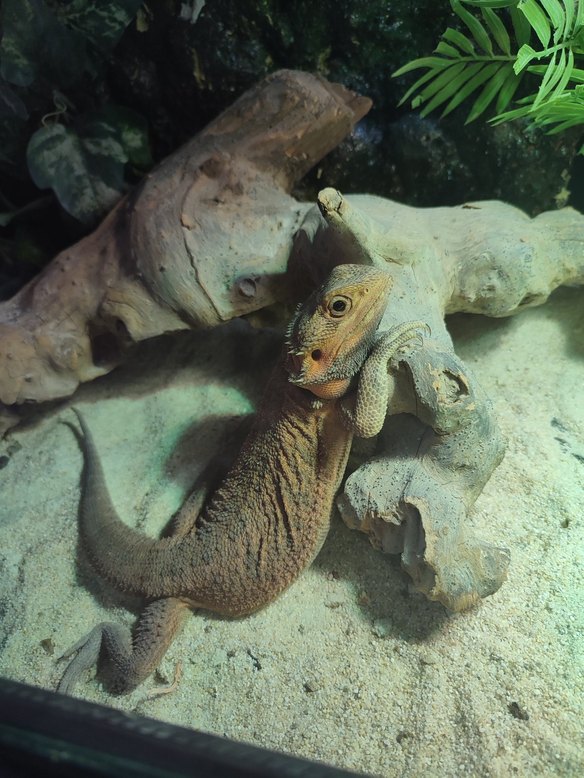 Hola, hace 5 días mi hermana me regaló su pogona con el terrario y todo lo que necesita, creo que es macho porque tiene la barba muy oscura, y según me dijo ella tiene 8 meses. En casa de mi hermana estaba en el comedor y tenía a la vista a los dos perros de mi hermana todo el tiempo, cuando la traje a casa puse el terrario en el comedor pero yo también tengo un perro y se ponía en el cristal de pie (he leído que es por estrés) entonces la puse en una habitación donde ya no lo ve, pero ya lleva 3 días ahí, está muy oscura y aveces sigue poniéndose en esa posición. Hoy la puse en el agua y el color le mejoro mucho pero al volver al terrario vuelve a lo mismo. Alguien sabe que puedo hacer para que no esté estresada?? Es por el cambio de casa?? Estamos intentando no cogerla, manosearla, ni molestar mucho... Es muy buena.