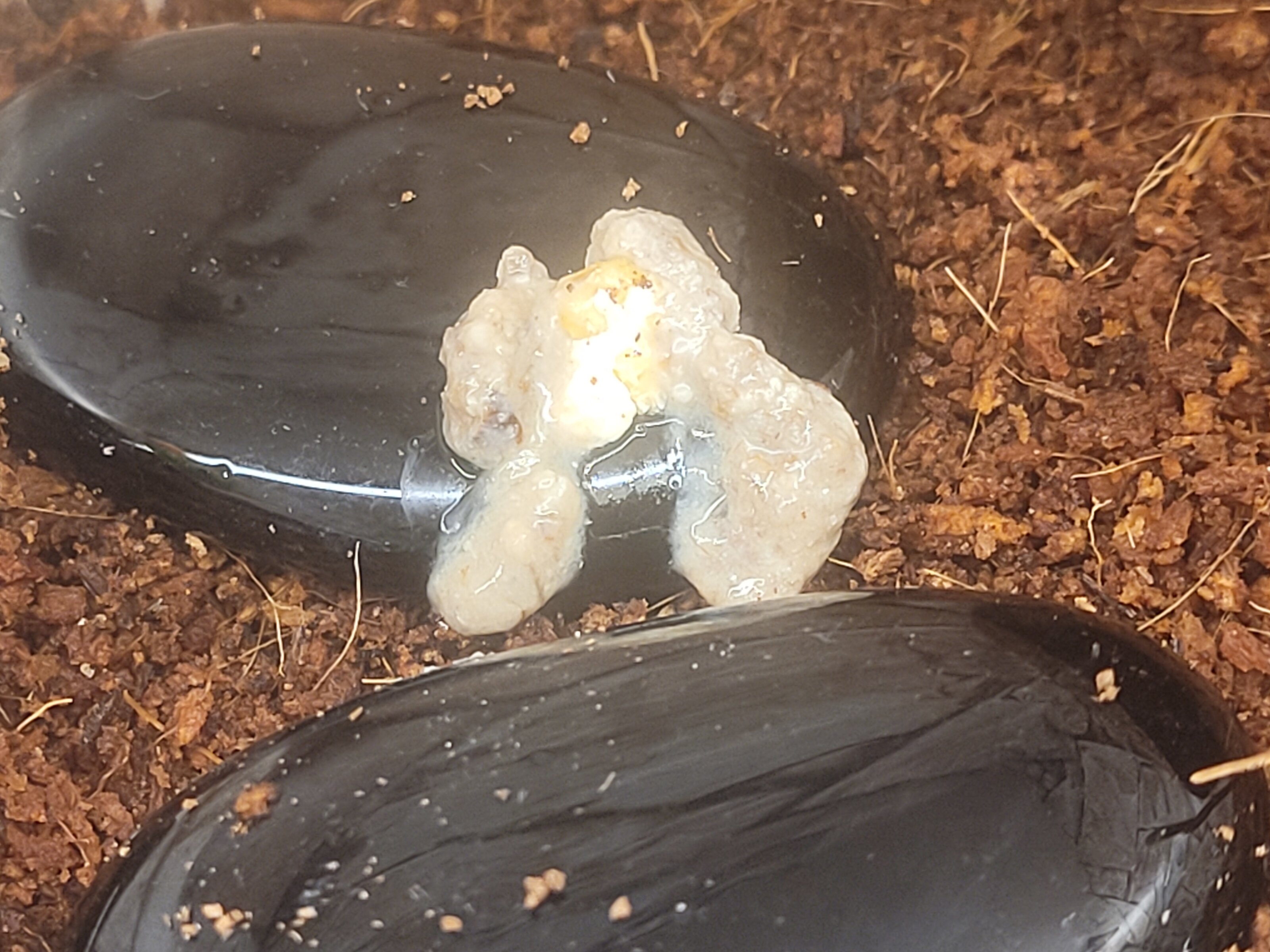 Desde que le traje esta escondido en su cueva y pensaba que no había comido. Le dejé tenebrios para que fuera cuando se sintiera cómodo, y pensaba que no había comido pero me acabo de encontrar una pasta blanca blanda como si hubiera vomitado alguno. Así que supongo que ha debido salir cuando no miraba pero esa plasta blanca sabeis si es normal?