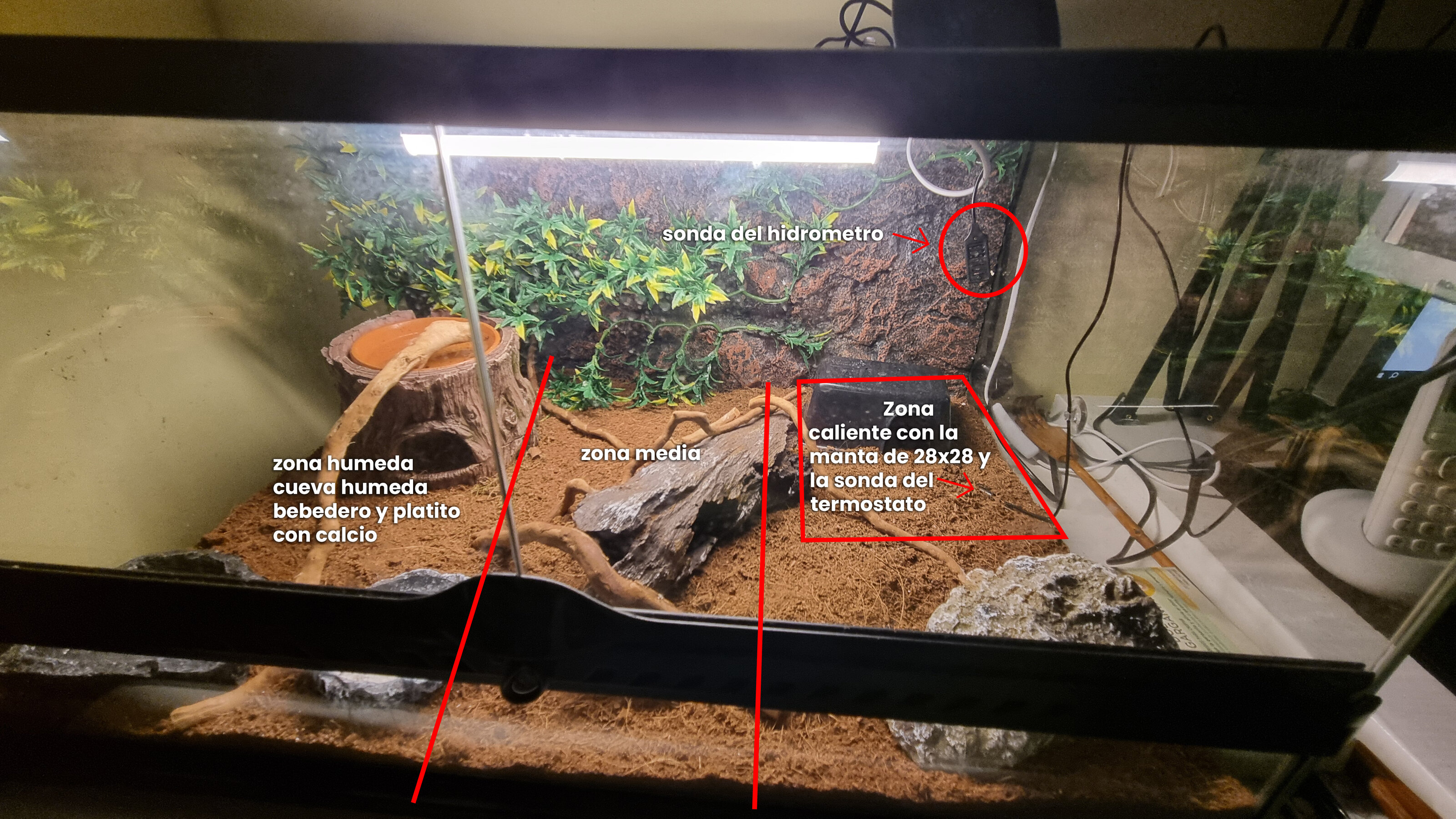Vale otro tema que sé que va a saltar por los aires o no, no lo sé, pero a mí en la tienda donde compre la manta térmica es como me recomendaron hacerlo y es más lo tienen puesto en la propia web que se utilice así. Yo la manta térmica la tengo por dentro del terrario, ya que por fuera no me agarraba la temperatura, entonces en esta tienda me recomendaron ponerla por dentro pero con un azulejo por encima o un cristal. Llevo así no sé 1 mes largo y no a pasado nada, pero me gustaría saber si está bien si está mal etc. Que sé que muchos o la gran mayoría me va a decir que está mal, pero a mí es lo que me dijeron y así estoy manteniendo la temperatura. Decir también que la tengo conectada a un termostato día y noche que corta cuando llega a los 31 y si baja a los 29 que vuelve a conectar solo hasta subir a los 30 31 grados. Lo mismo por la noche cuando llegan las 21:00 se apaga tanto la luz que le tengo puesta simplemente es una luz led no es una uvb ni nada es una luz led y listo. Y en la bajada de la temperatura sí que tengo un problemilla y es que no consigo que baje a los 19 20 grados, siempre se me queda en unos 24 23 más o menos. Esto puede ser porque mi casa está con la calefacción y demás no lo sé, pero ahí sí que no consigo bajarle la temperatura por la noche hasta esos 19 20 grados, capaz cuando le cambie el sustrato si se lo cambio, igual si consigo que baje, ya que al ser "arena" creo o pienso que no acumulara tanto calor como el sustrato de coco. (la manta es de 28x28) Os dejo el enlace de donde la compre y donde pone si os fijáis que se ponga en el interior del terrario, aparte yo lo pregunte y lo consulte con ellos por WhatsApp y me lo recalcaron que así se hiciese. (La manta termica es esta)