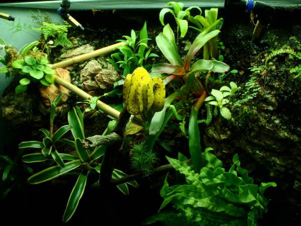 Tambien me gustaria hacerle unas preguntas para que me de consejo. Mi morelia esta en un terrario de 90x50x90 (Largo x Ancho x Alto), se calienta con florescentes t5, tiene dos cascadas y (aunque no se vean) un monton de cañas de bambu horizontalmente colocadas, tambien tiene gradientes de temperatura desde 31ºC zona mas caliente, hasta unos 16ºC zona mas fria, tiene como 10 zonas con grados diferentes de humedad. Plantas naturales TODAS, y con sus relieves en forma de roca.