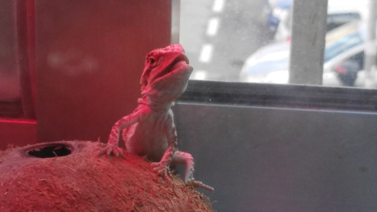 dale el alimento vivo con pinzas nunca suelto. que disfrutes tu mascota , pero lo de la fibra de coco es verdad yo conozco a gente que la usa y su pogona tiene 6 años.