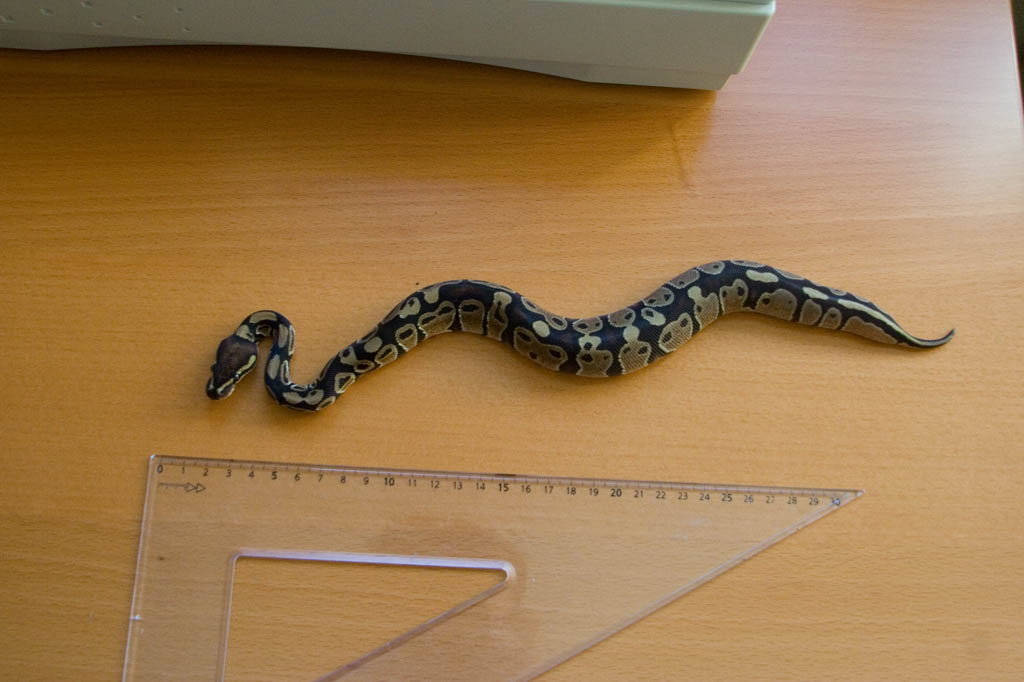 La mido con el programa este de snake measurer, pero tampoco es que sea lo mas exacto del mundo, porque he hecho otra medicion con una foto del mismo dia, y con una postura parecida de la serpiente, y me han salido 42 cm. De todas formas, como eso no me afecta de momento en absoluto, digo que mide mas o menos 40 cm y listo