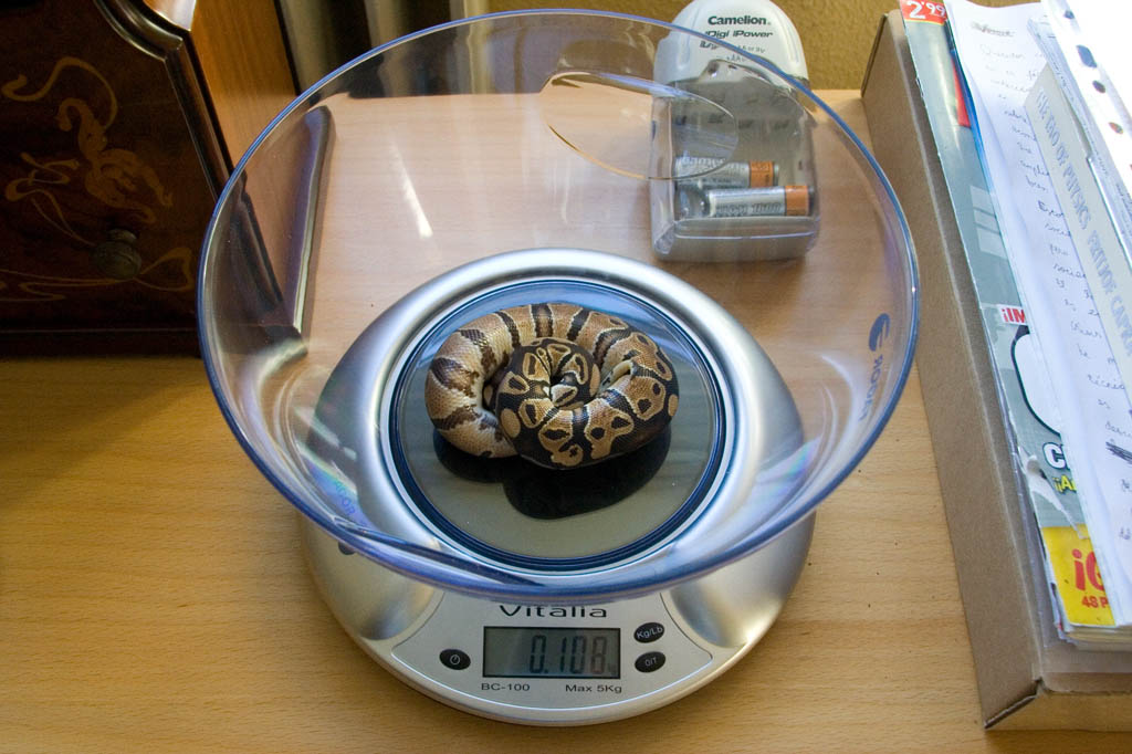 De todas formas, es que no se que hacer con el alimento. Esta un poco delgada para hacerle pasar hambre (92g/42cm) y recien sacrificado no me acepta, asi que prefiero confiar en que el raton no tendra miedo de la serpiente hasta que le toque recibir un cariñoso abrazo.